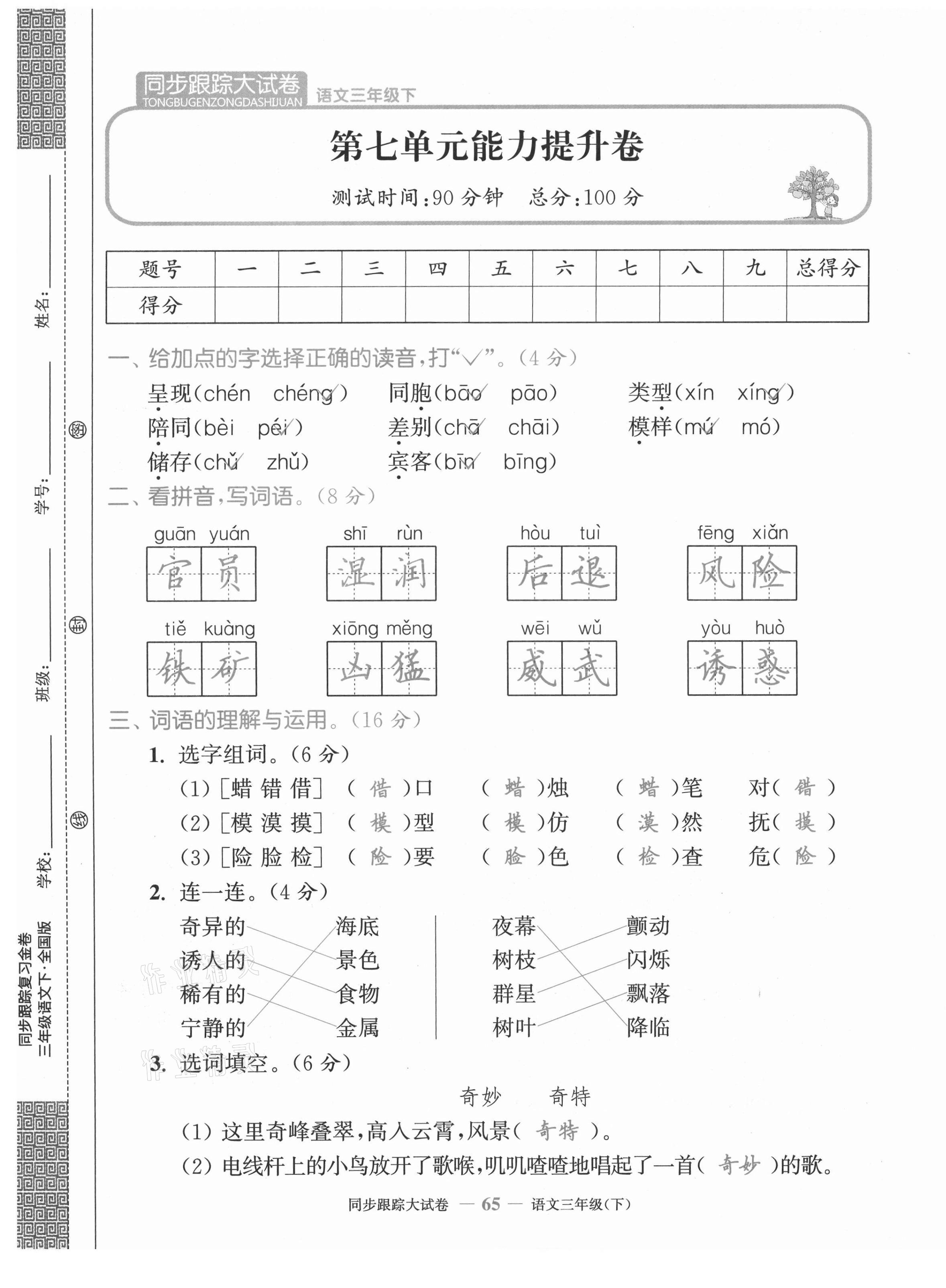 2021年复习金卷同步跟踪大试卷三年级语文下册人教版