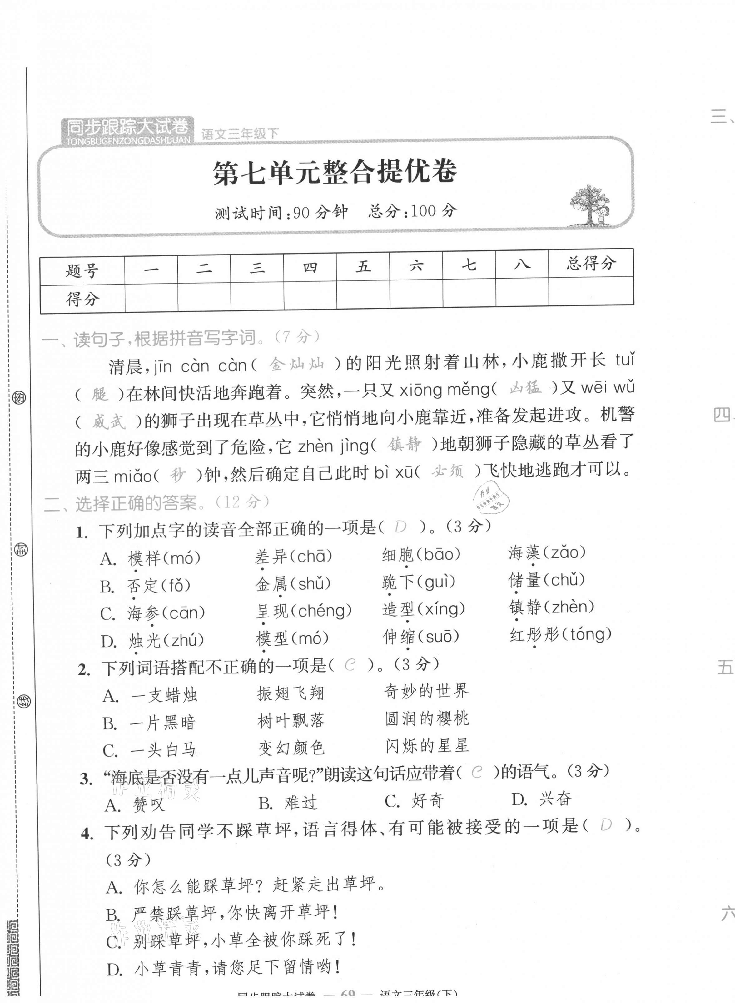 注:目前有些书本章节名称可能整理的还不是很完善,但都是按照顺序排列的,请同学们按照顺序仔细查找。练习册 2021年复习金卷同步跟踪大试卷三年级语文下册人教版 答案主要是用来给同学们做完题方便对答案用的,请勿直接抄袭。