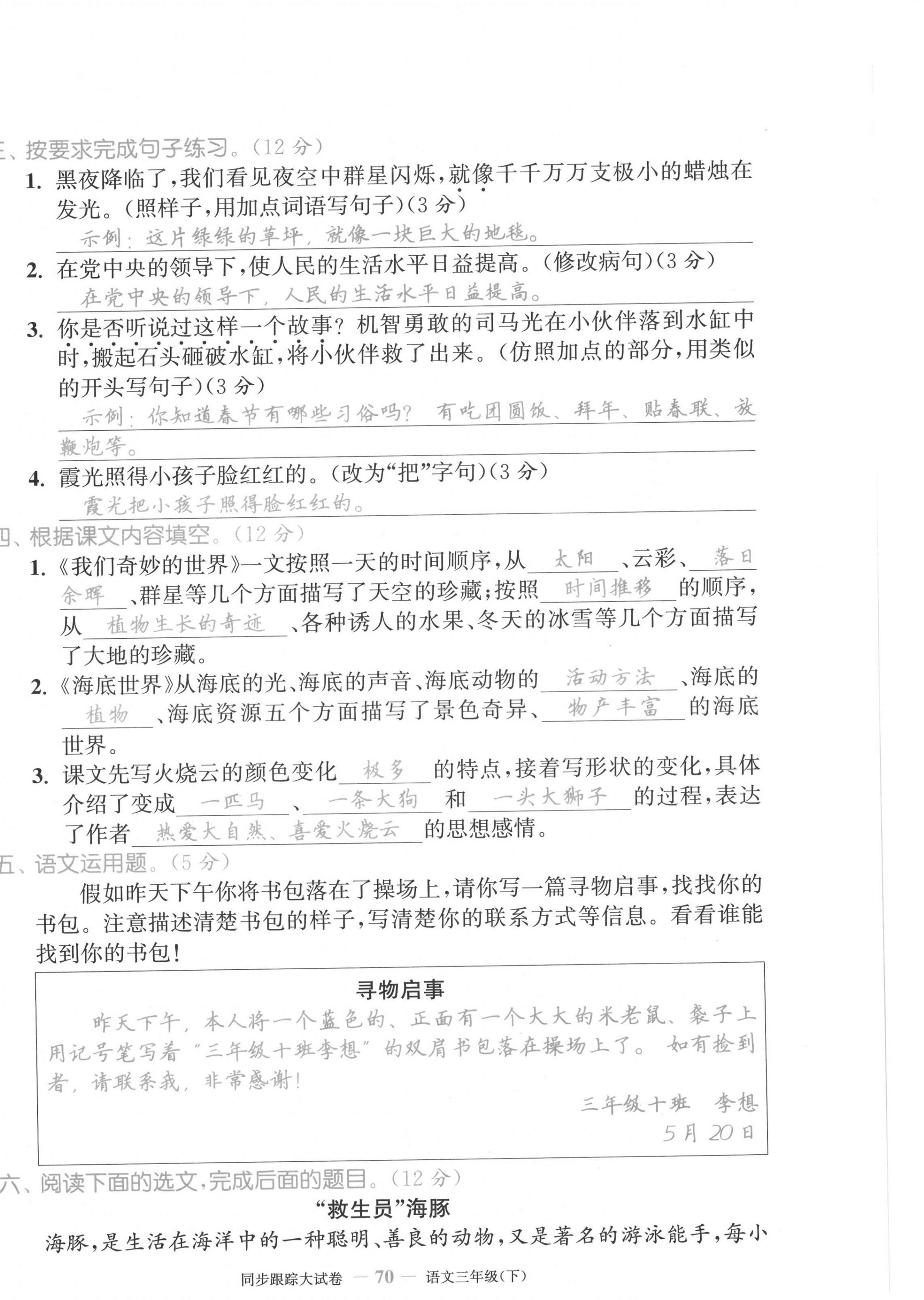 注:目前有些书本章节名称可能整理的还不是很完善,但都是按照顺序排列的,请同学们按照顺序仔细查找。练习册 2021年复习金卷同步跟踪大试卷三年级语文下册人教版 答案主要是用来给同学们做完题方便对答案用的,请勿直接抄袭。