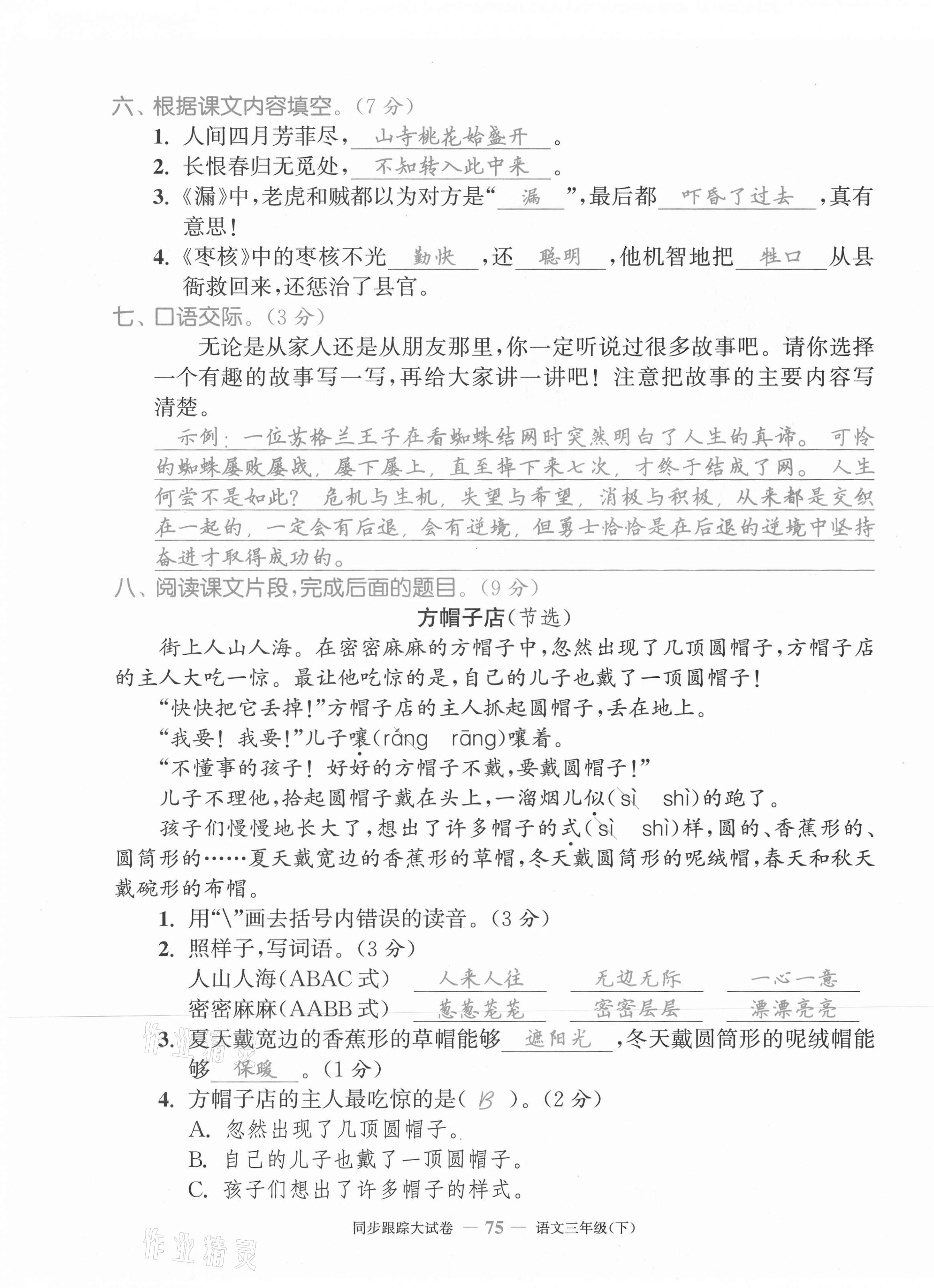 注:目前有些书本章节名称可能整理的还不是很完善,但都是按照顺序排列的,请同学们按照顺序仔细查找。练习册 2021年复习金卷同步跟踪大试卷三年级语文下册人教版 答案主要是用来给同学们做完题方便对答案用的,请勿直接抄袭。