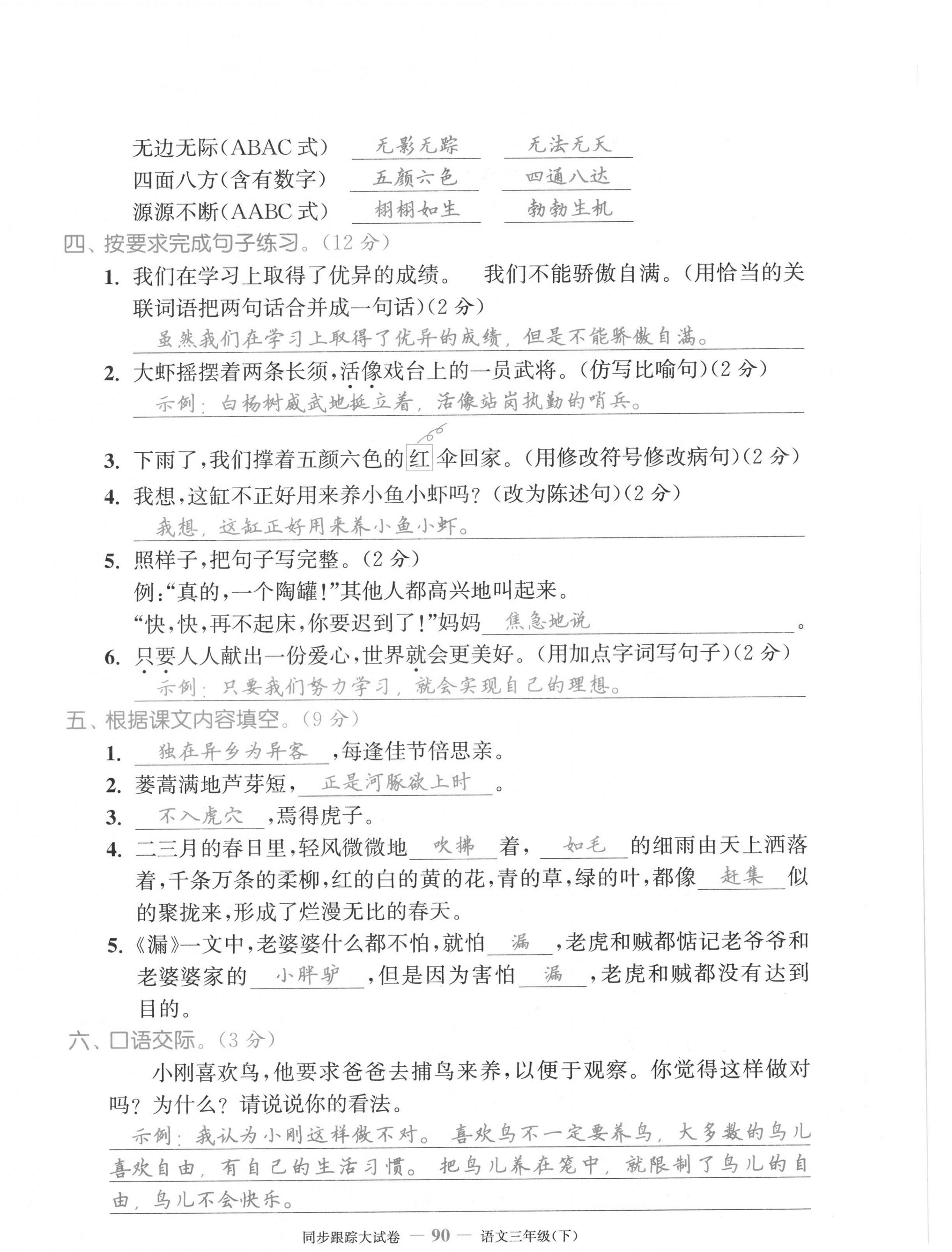 注:目前有些书本章节名称可能整理的还不是很完善,但都是按照顺序排列的,请同学们按照顺序仔细查找。练习册 2021年复习金卷同步跟踪大试卷三年级语文下册人教版 答案主要是用来给同学们做完题方便对答案用的,请勿直接抄袭。