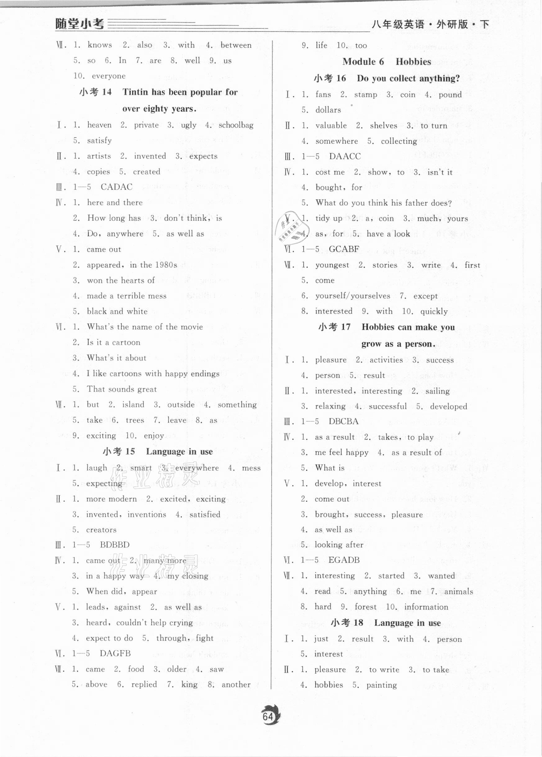 注:目前有些书本章节名称可能整理的还不是很完善,但都是按照顺序排列的,请同学们按照顺序仔细查找。练习册 2021年随堂小考八年级英语下册外研版 答案主要是用来给同学们做完题方便对答案用的,请勿直接抄袭。