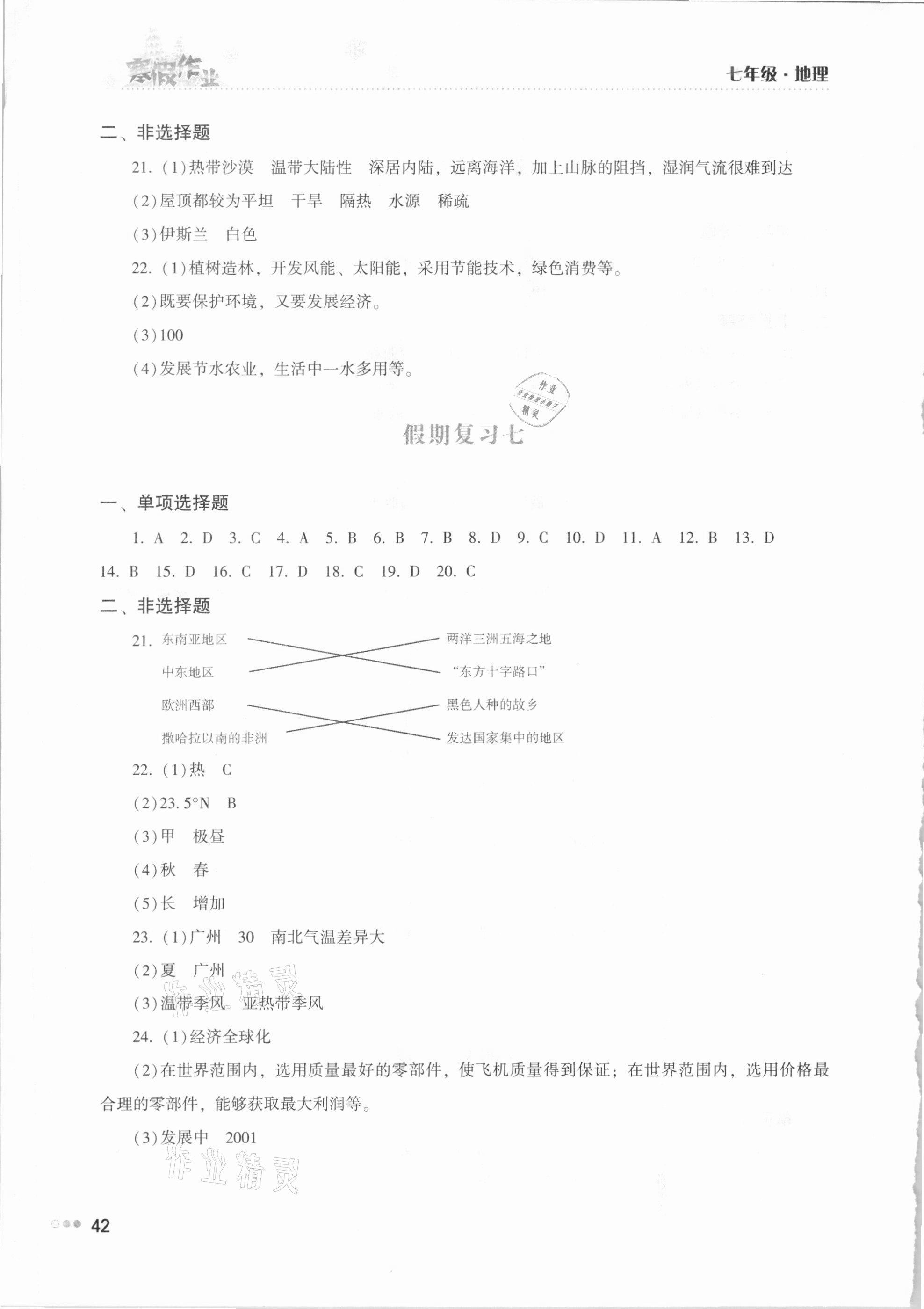 2021年寒假作业完美假期生活七年级地理湖南教育出版社