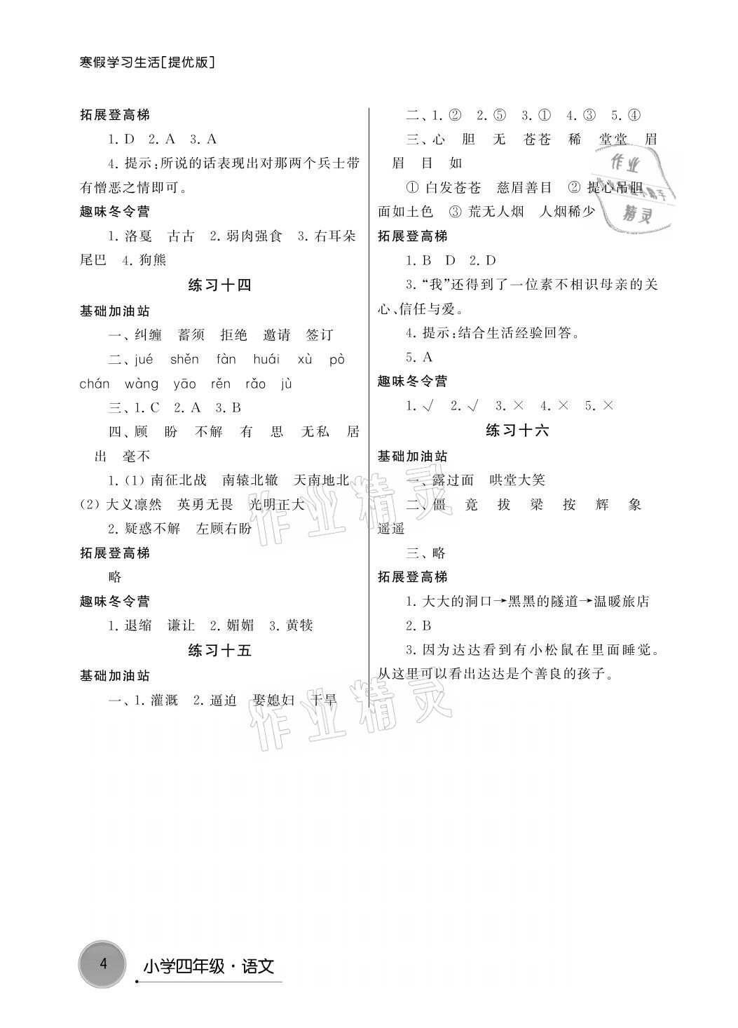 注:目前有些书本章节名称可能整理的还不是很完善,但都是按照顺序排列的,请同学们按照顺序仔细查找。练习册 2021年寒假学习生活四年级语文提优版译林出版社 答案主要是用来给同学们做完题方便对答案用的,请勿直接抄袭。