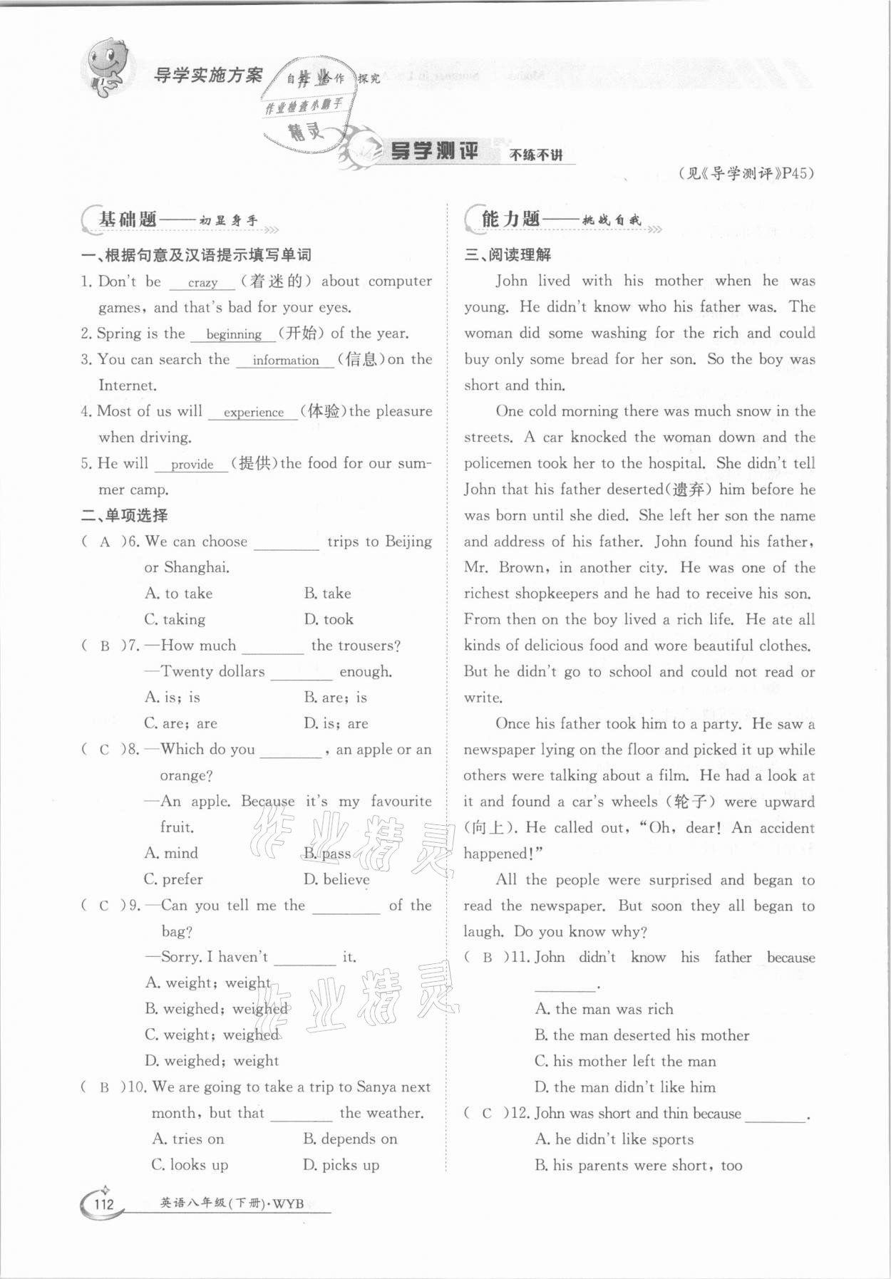 注:目前有些书本章节名称可能整理的还不是很完善,但都是按照顺序排列的,请同学们按照顺序仔细查找。练习册 2021年金太阳导学测评八年级英语下册外研版 答案主要是用来给同学们做完题方便对答案用的,请勿直接抄袭。