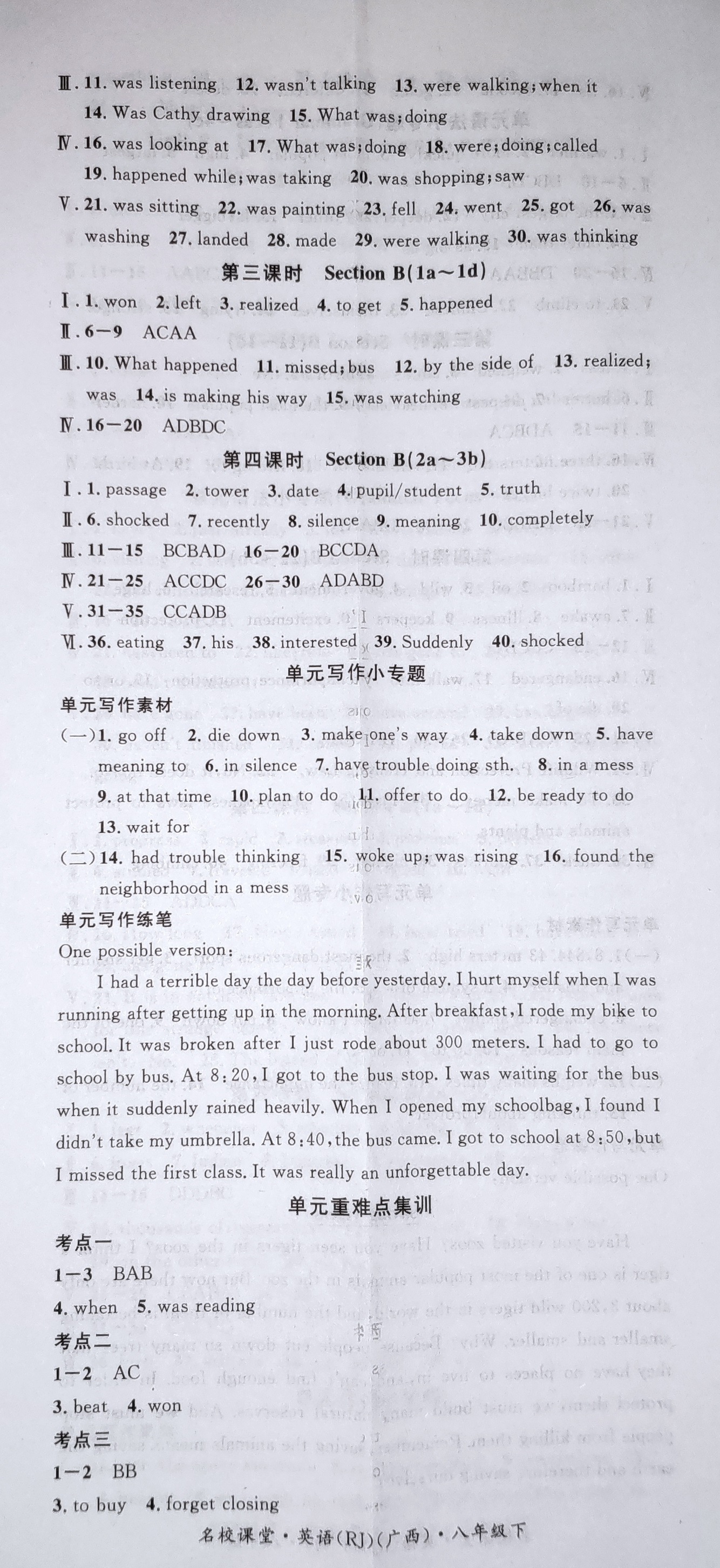 注:目前有些书本章节名称可能整理的还不是很完善,但都是按照顺序排列的,请同学们按照顺序仔细查找。练习册 2021年名校课堂八年级英语下册人教版1广西专版 答案主要是用来给同学们做完题方便对答案用的,请勿直接抄袭。