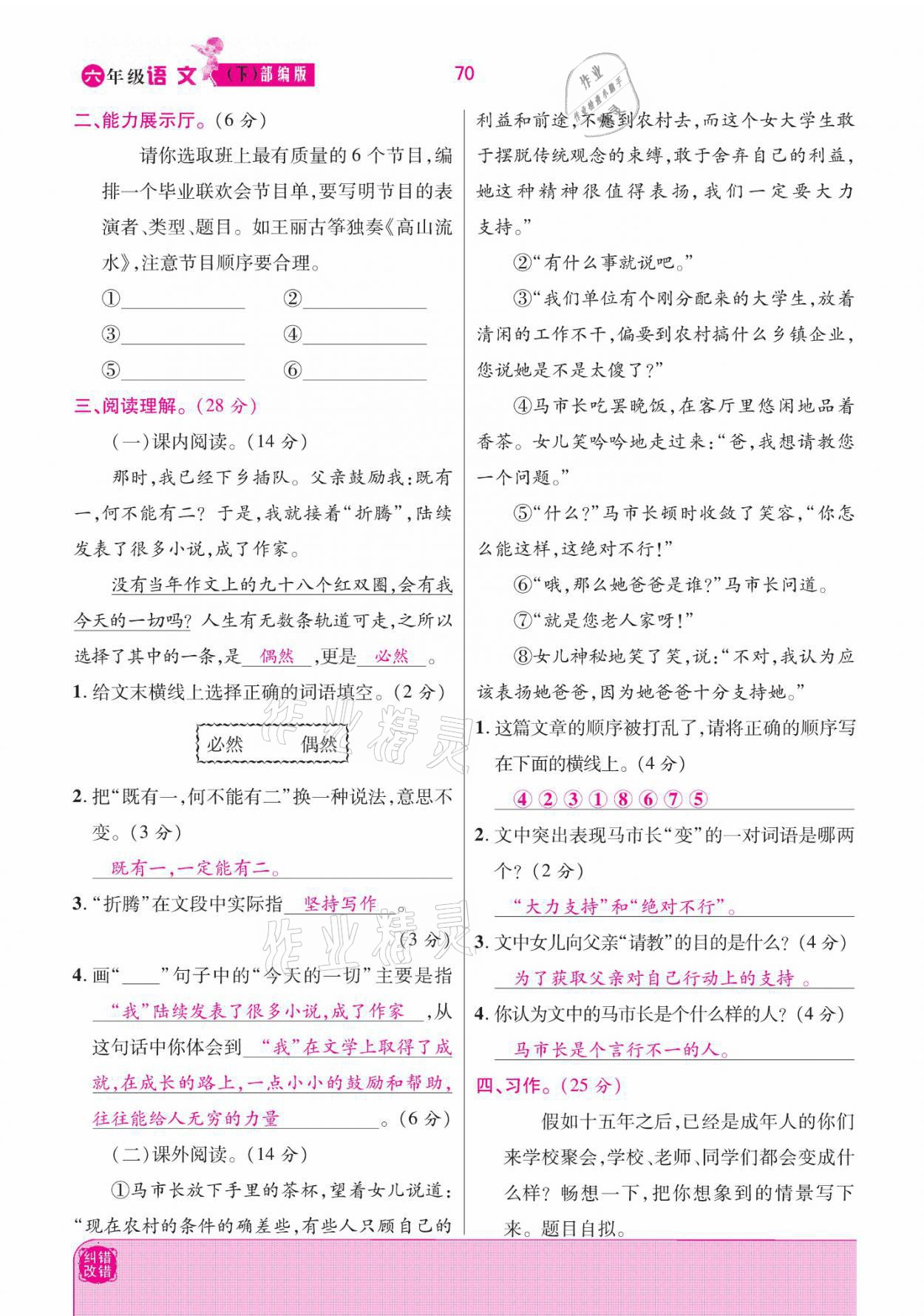 注:目前有些书本章节名称可能整理的还不是很完善,但都是按照顺序排列的,请同学们按照顺序仔细查找。练习册 2021年小学课时优练六年级语文下册部编版 答案主要是用来给同学们做完题方便对答案用的,请勿直接抄袭。