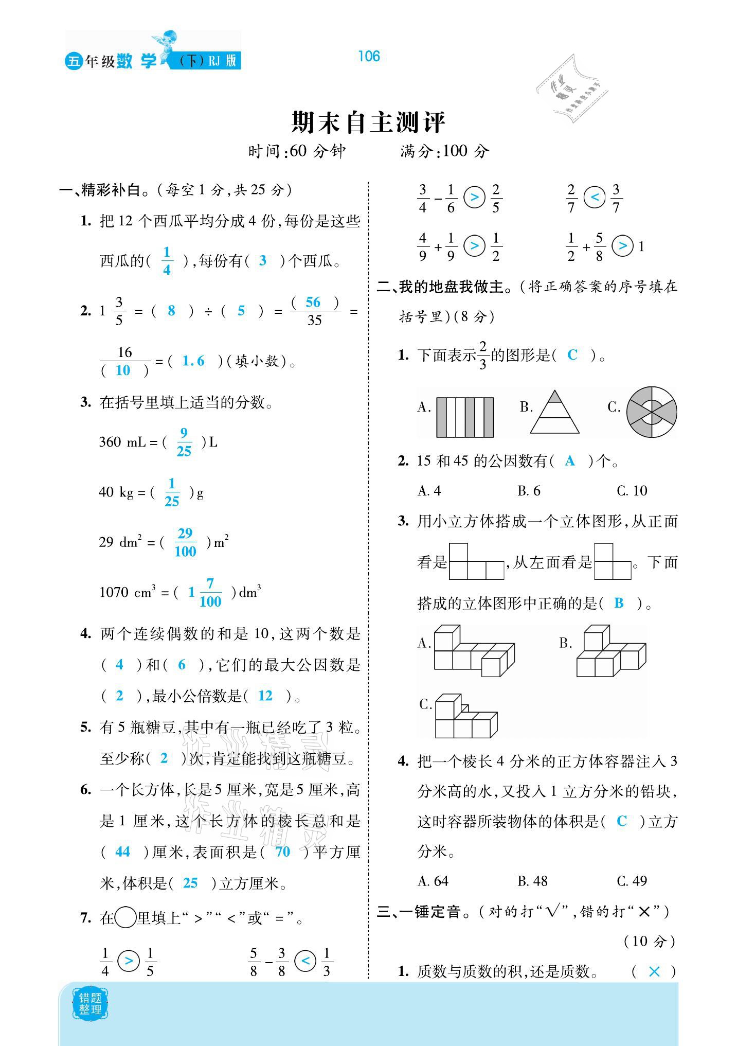 注:目前有些书本章节名称可能整理的还不是很完善,但都是按照顺序排列的,请同学们按照顺序仔细查找。练习册 2021年小学课时优练五年级数学下册人教版新版 答案主要是用来给同学们做完题方便对答案用的,请勿直接抄袭。