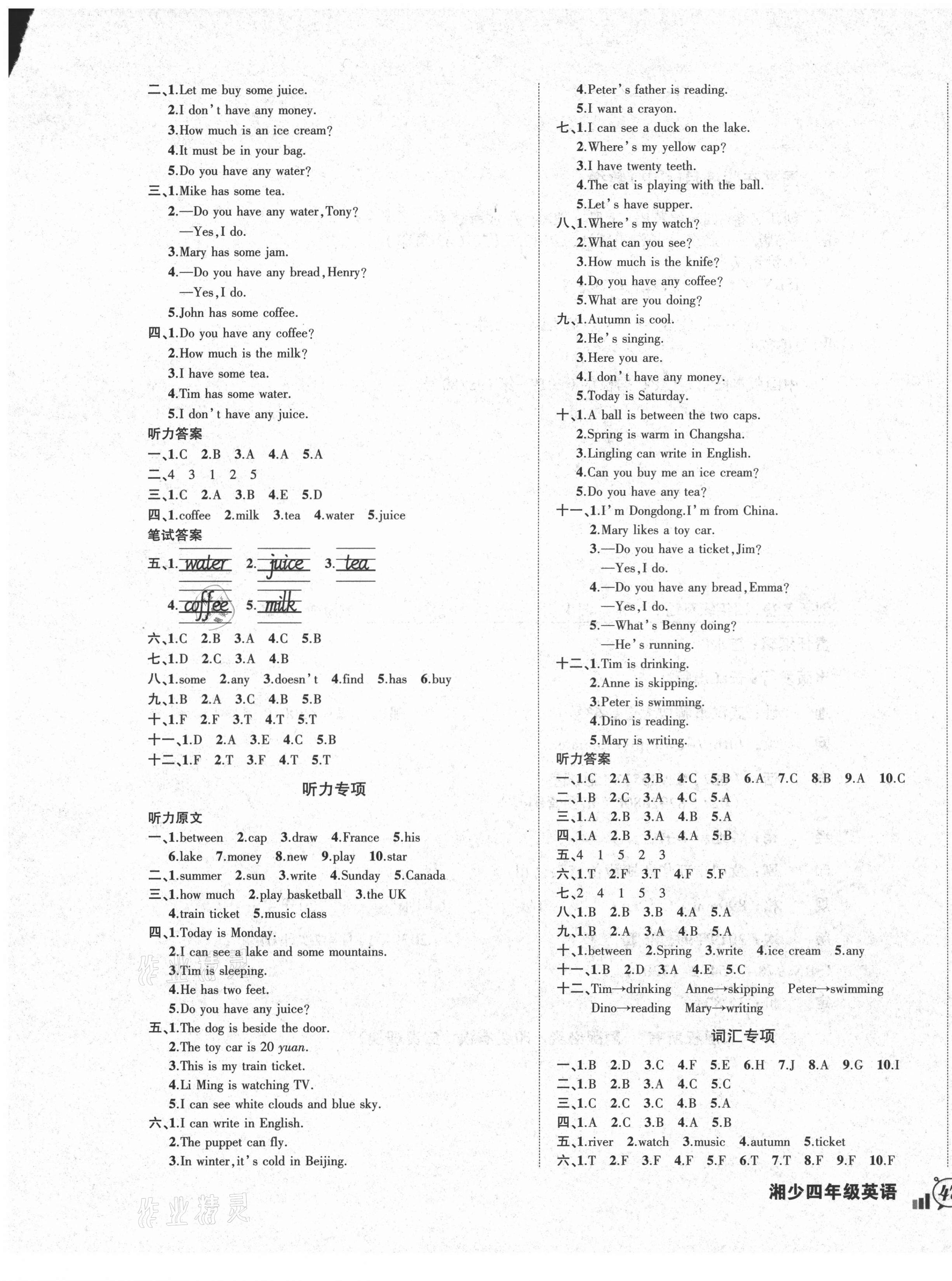 注:目前有些书本章节名称可能整理的还不是很完善,但都是按照顺序排列的,请同学们按照顺序仔细查找。练习册 2021年状元成才路创新名卷四年级英语下册湘少版 答案主要是用来给同学们做完题方便对答案用的,请勿直接抄袭。