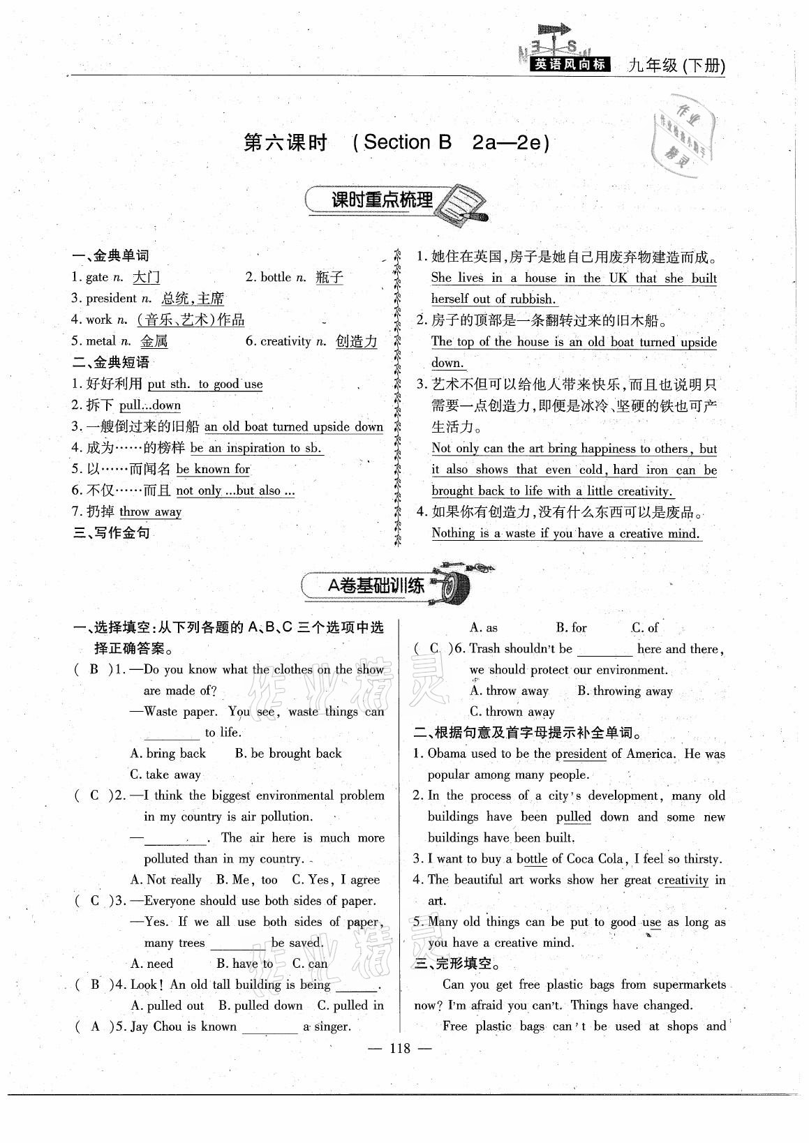 注:目前有些书本章节名称可能整理的还不是很完善,但都是按照顺序排列的,请同学们按照顺序仔细查找。练习册 2021年英语风向标九年级下册人教版蓉城专版 答案主要是用来给同学们做完题方便对答案用的,请勿直接抄袭。