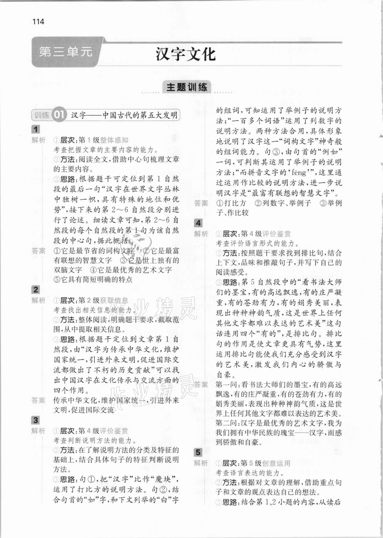 注:目前有些书本章节名称可能整理的还不是很完善,但都是按照顺序排列的,请同学们按照顺序仔细查找。练习册 2021年一本阅读能力训练100分五年级语文B版 答案主要是用来给同学们做完题方便对答案用的,请勿直接抄袭。