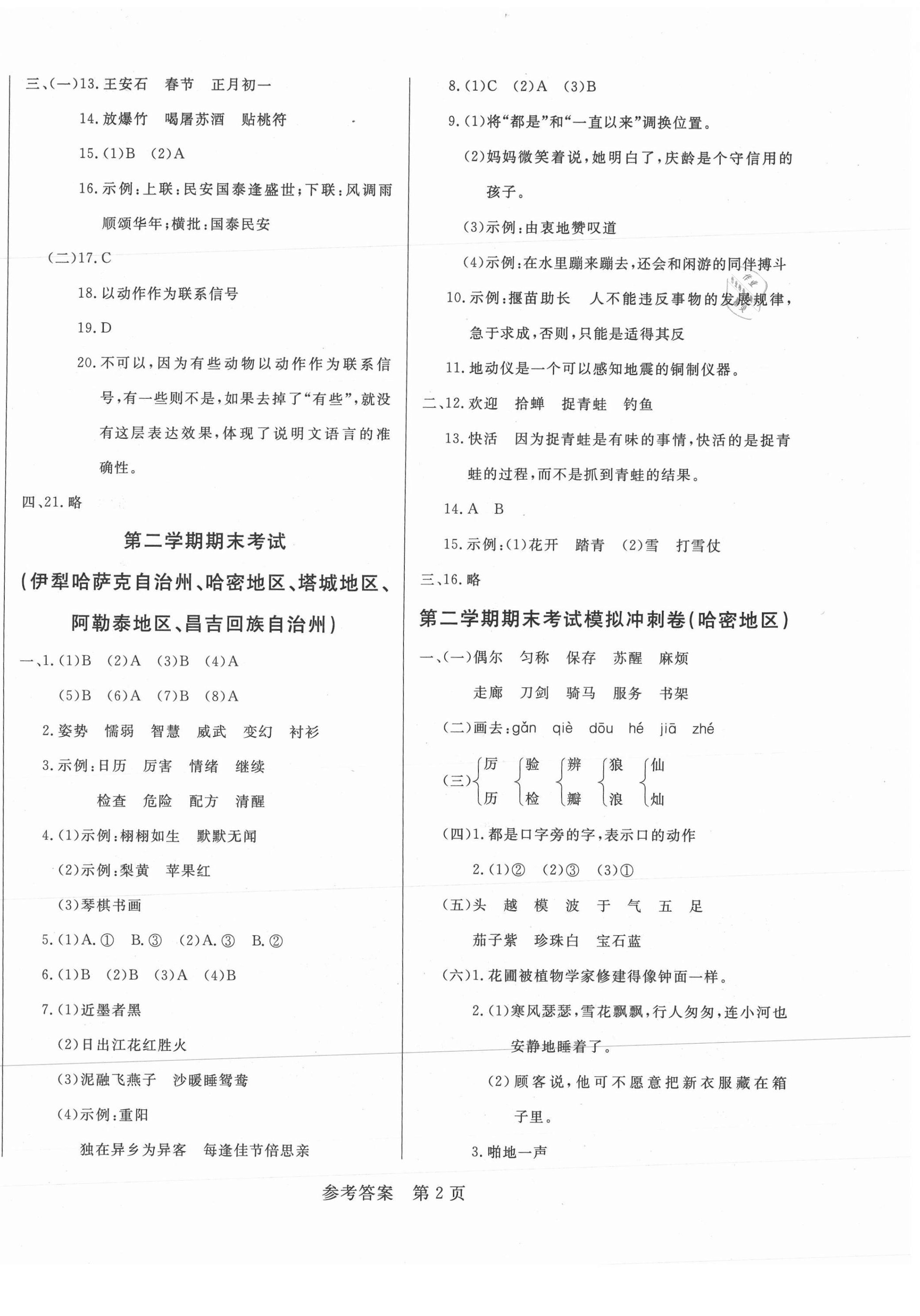 注:目前有些书本章节名称可能整理的还不是很完善,但都是按照顺序排列的,请同学们按照顺序仔细查找。练习册 2021年黄冈名卷三年级语文下册人教版新疆专版 答案主要是用来给同学们做完题方便对答案用的,请勿直接抄袭。