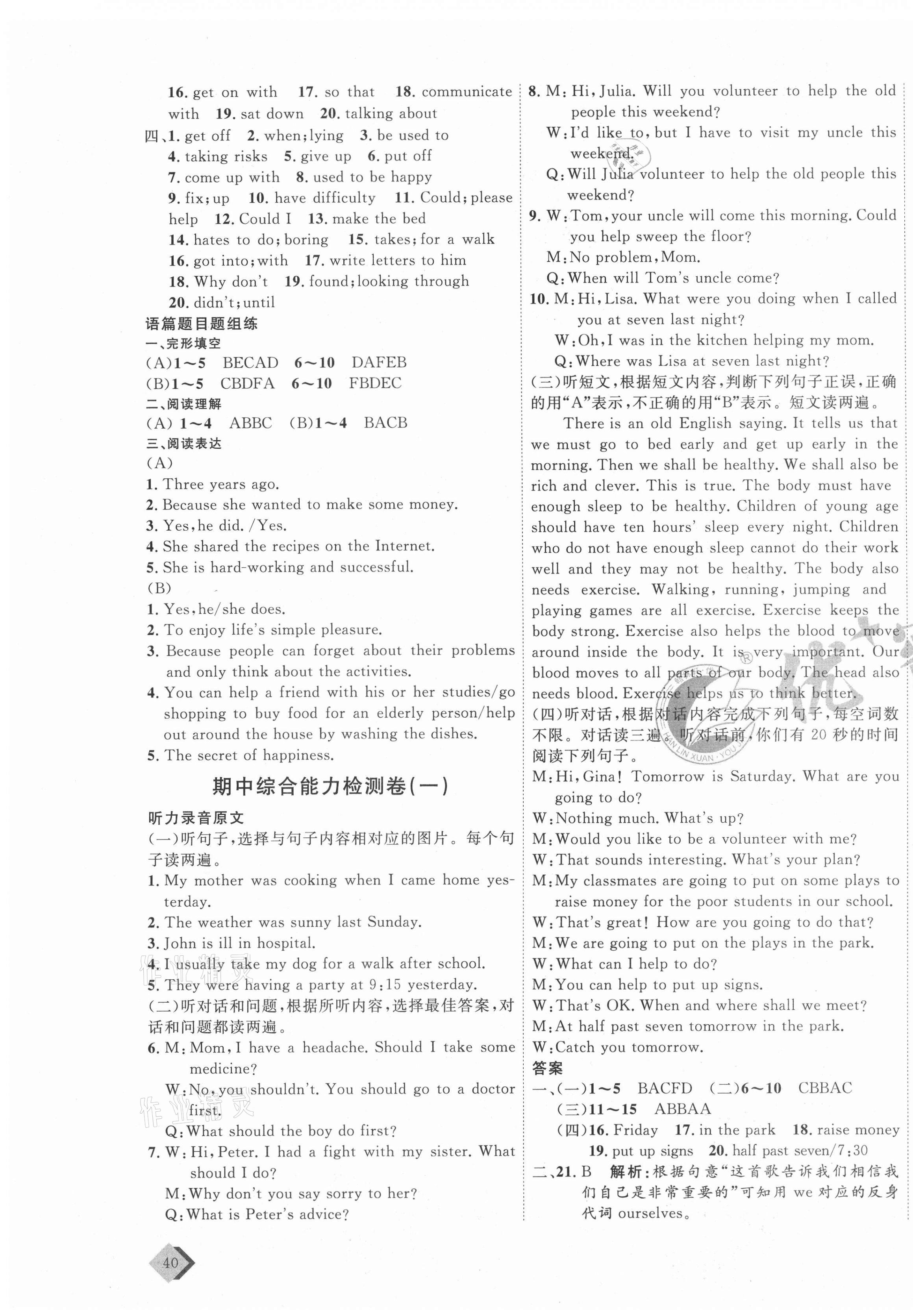 注:目前有些书本章节名称可能整理的还不是很完善,但都是按照顺序排列的,请同学们按照顺序仔细查找。练习册 2021年优加密卷八年级英语下册人教版临沂专版 答案主要是用来给同学们做完题方便对答案用的,请勿直接抄袭。