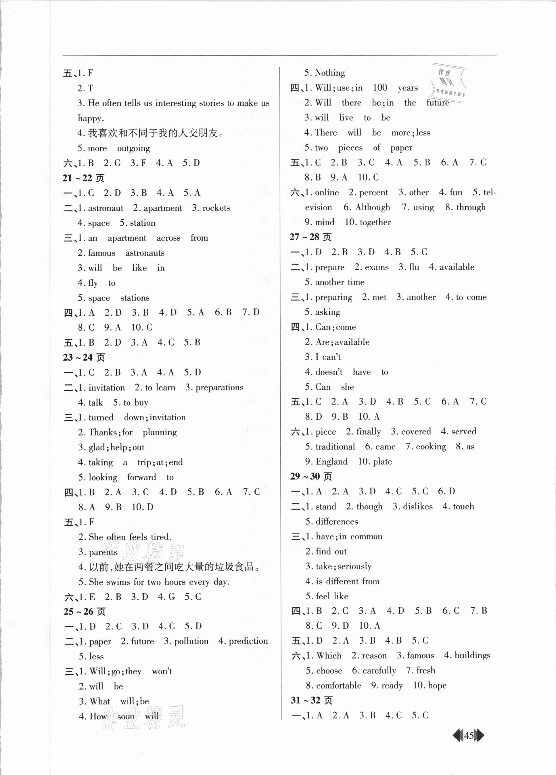 注:目前有些书本章节名称可能整理的还不是很完善,但都是按照顺序排列的,请同学们按照顺序仔细查找。练习册 2021年欢乐春节快乐学八年级英语 答案主要是用来给同学们做完题方便对答案用的,请勿直接抄袭。