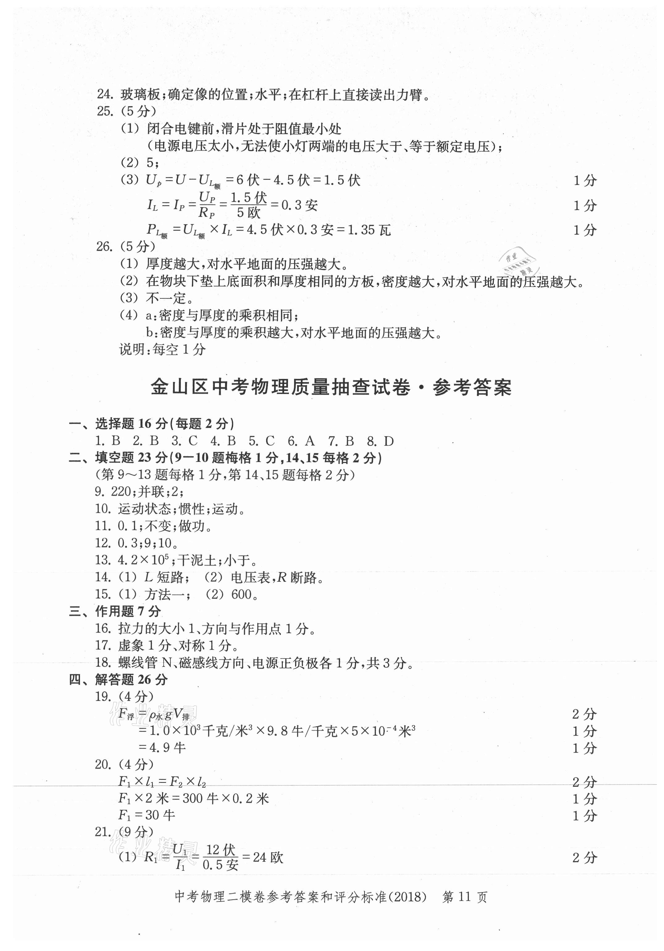 2021年走向成功上海市各区中考考前质量抽查试卷精编物理合订本