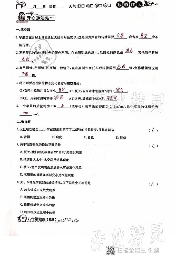 2021年快乐假期寒假作业八年级物理人教版延边教育出版社