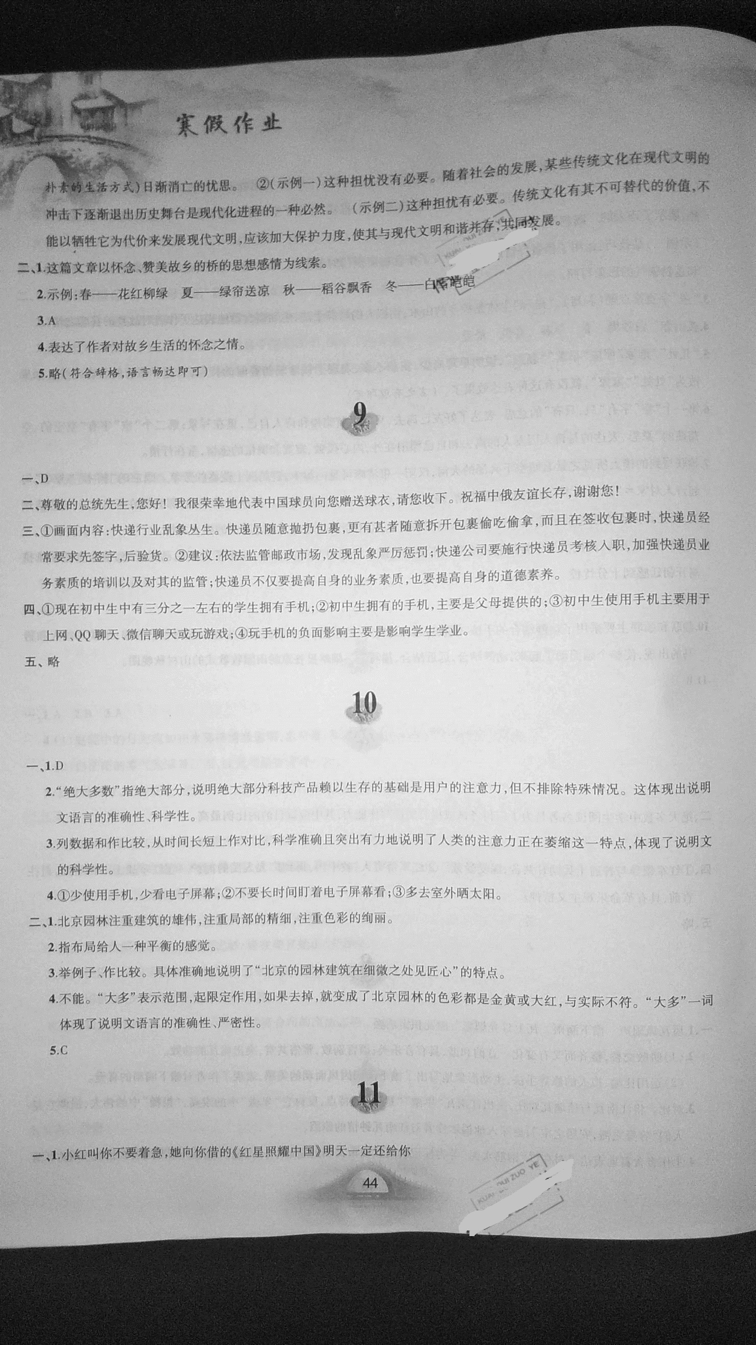 注:目前有些书本章节名称可能整理的还不是很完善,但都是按照顺序排列的,请同学们按照顺序仔细查找。练习册 2021年寒假作业八年级语文人教版黄山书社 答案主要是用来给同学们做完题方便对答案用的,请勿直接抄袭。