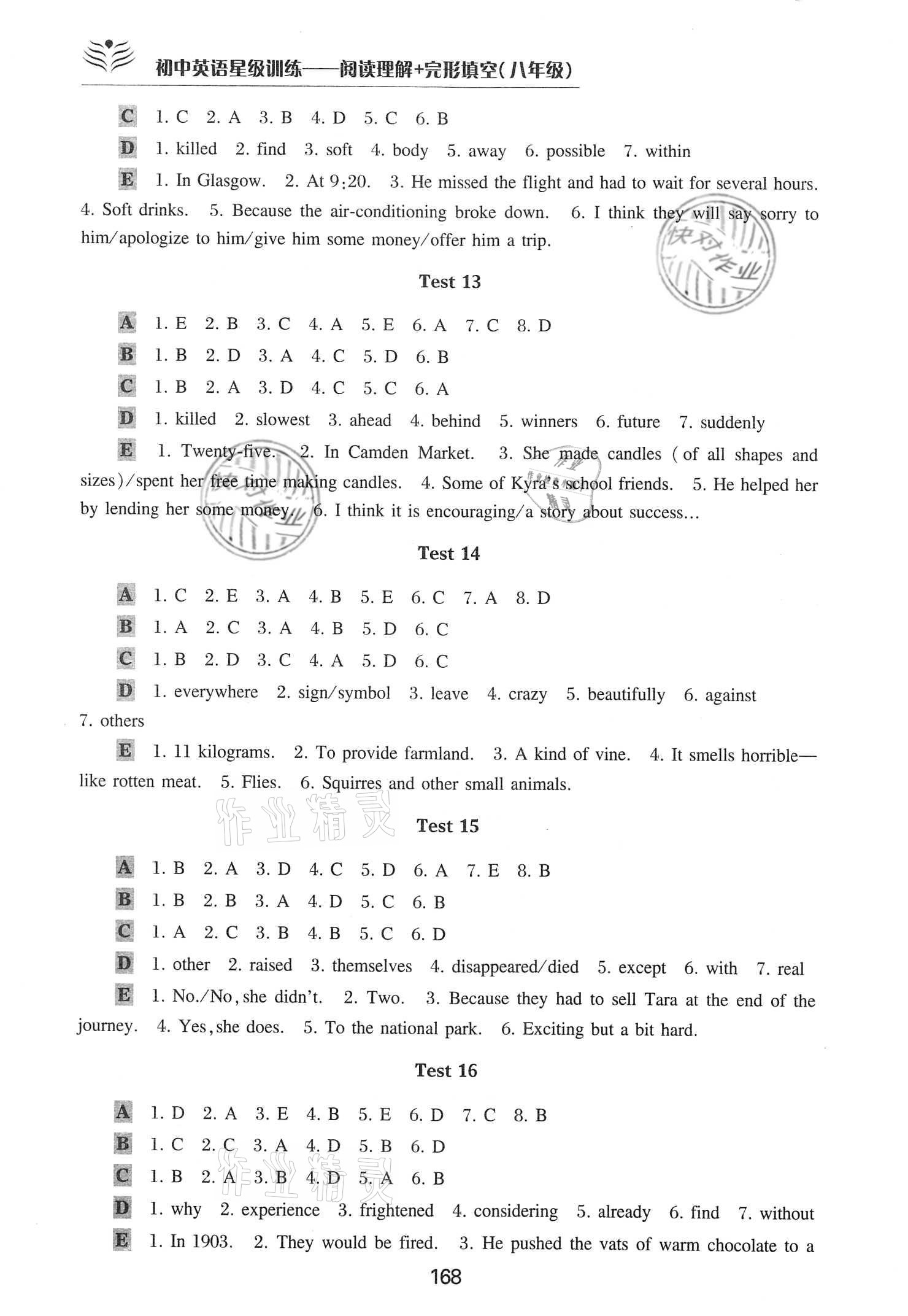 注:目前有些书本章节名称可能整理的还不是很完善,但都是按照顺序排列的,请同学们按照顺序仔细查找。练习册 2021年初中英语星级训练阅读理解加完形填空八年级 答案主要是用来给同学们做完题方便对答案用的,请勿直接抄袭。
