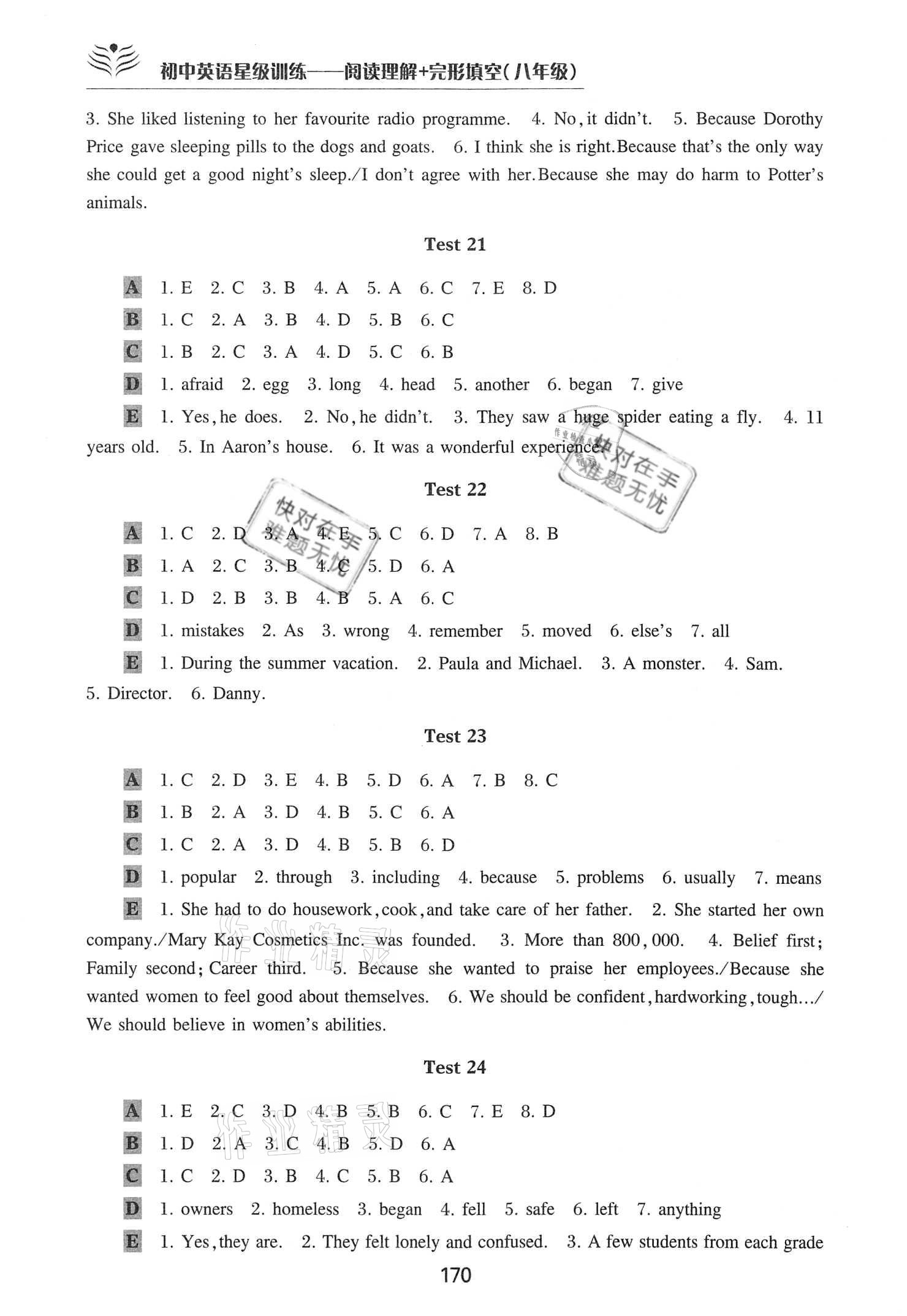 注:目前有些书本章节名称可能整理的还不是很完善,但都是按照顺序排列的,请同学们按照顺序仔细查找。练习册 2021年初中英语星级训练阅读理解加完形填空八年级 答案主要是用来给同学们做完题方便对答案用的,请勿直接抄袭。