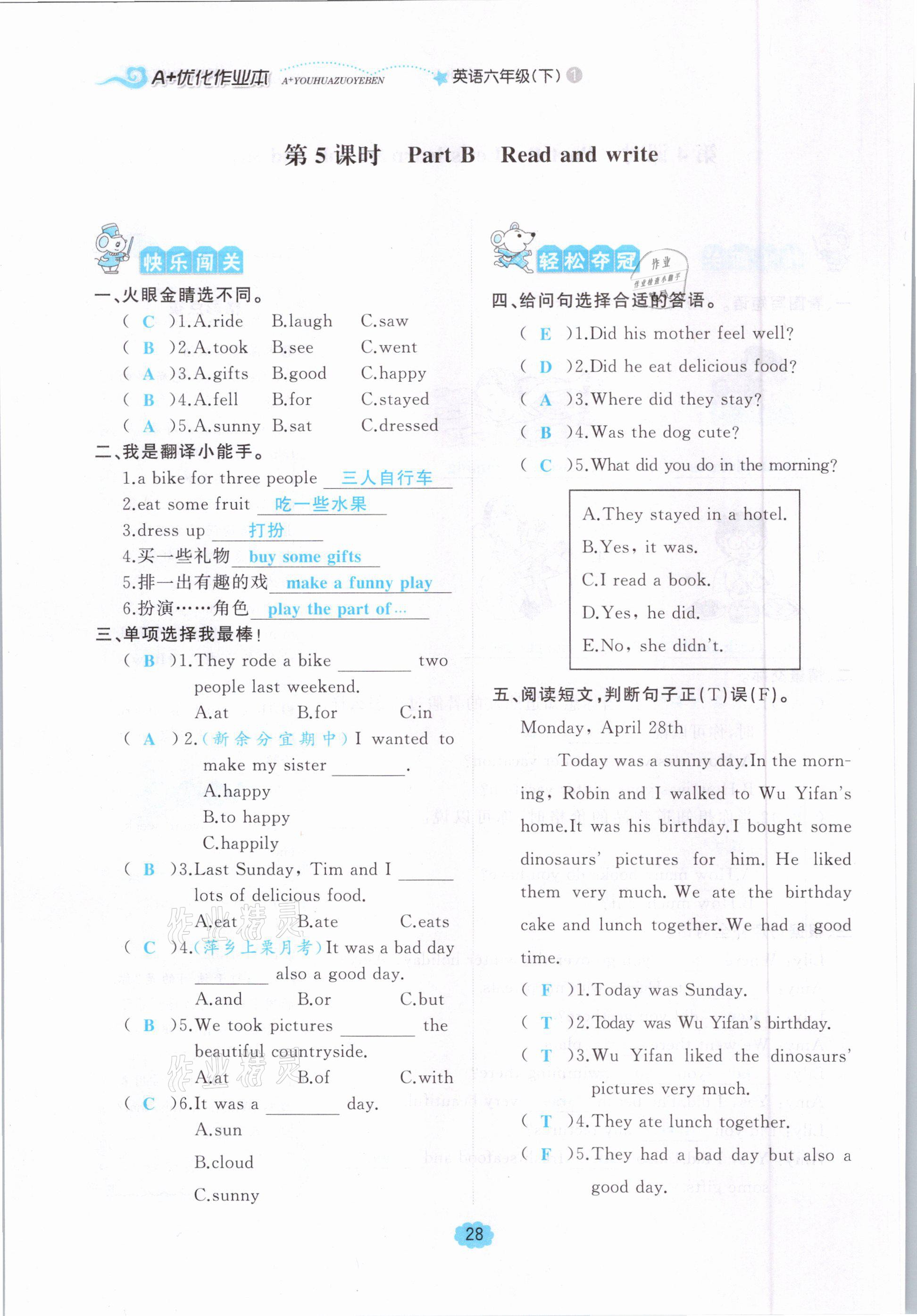 注:目前有些书本章节名称可能整理的还不是很完善,但都是按照顺序排列的,请同学们按照顺序仔细查找。练习册 2021年A加优化作业本六年级英语下册人教PEP版江西专版 答案主要是用来给同学们做完题方便对答案用的,请勿直接抄袭。