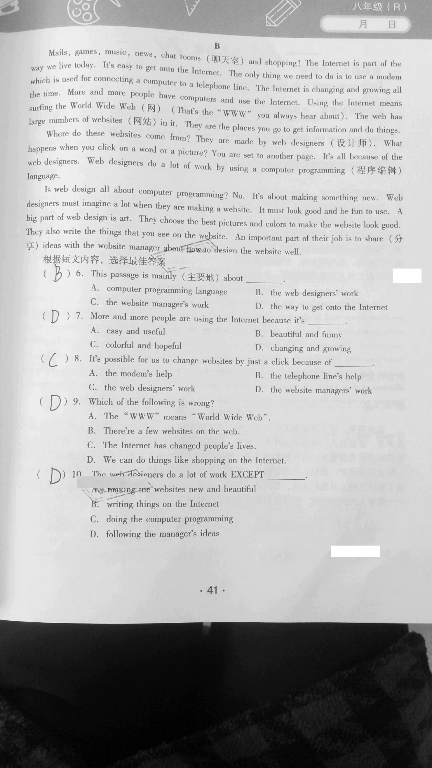 注:目前有些书本章节名称可能整理的还不是很完善,但都是按照顺序排列的,请同学们按照顺序仔细查找。练习册 2021年优佳学案寒假活动八年级英语人教版 答案主要是用来给同学们做完题方便对答案用的,请勿直接抄袭。