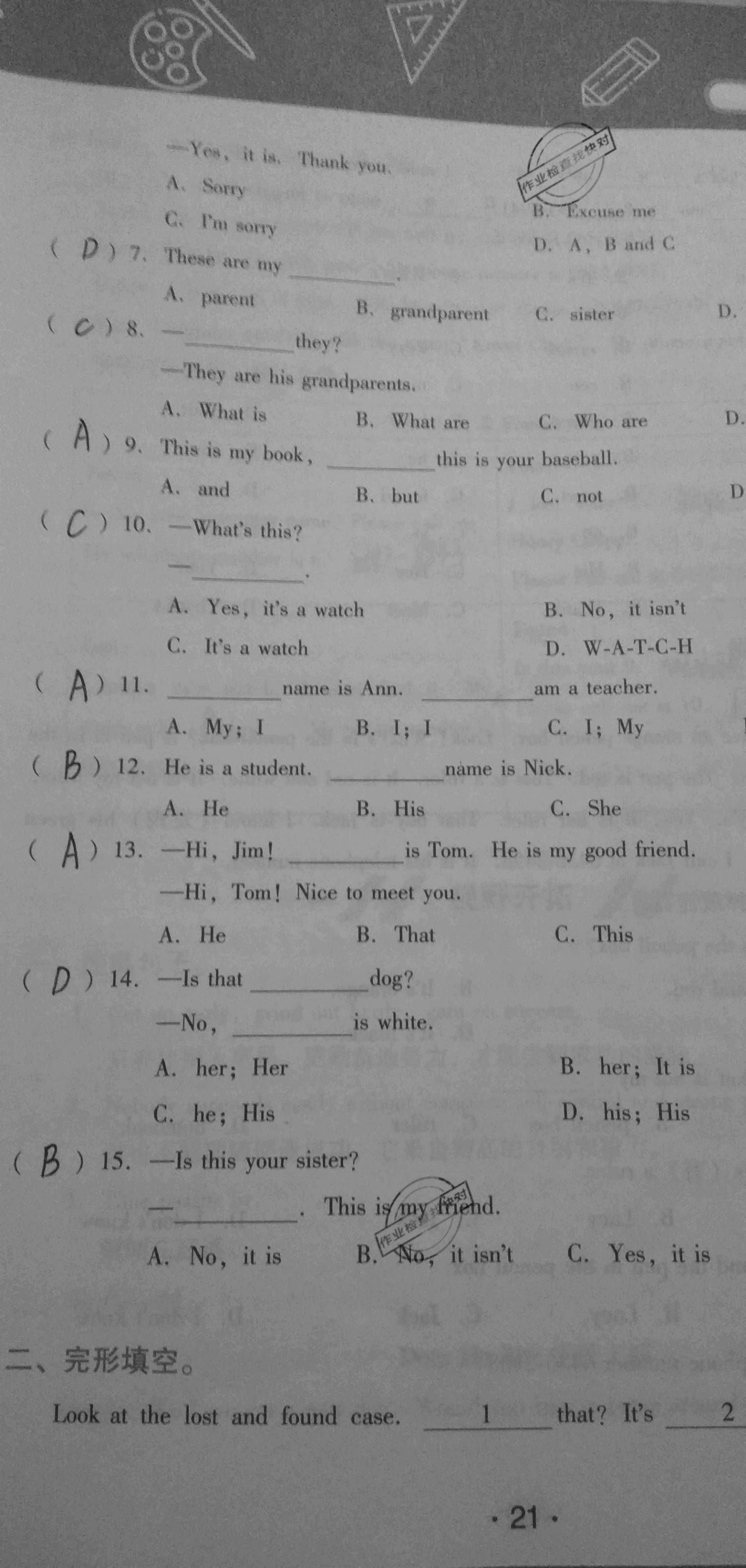 注:目前有些书本章节名称可能整理的还不是很完善,但都是按照顺序排列的,请同学们按照顺序仔细查找。练习册 2021年优佳学案寒假活动七年级英语人教版 答案主要是用来给同学们做完题方便对答案用的,请勿直接抄袭。