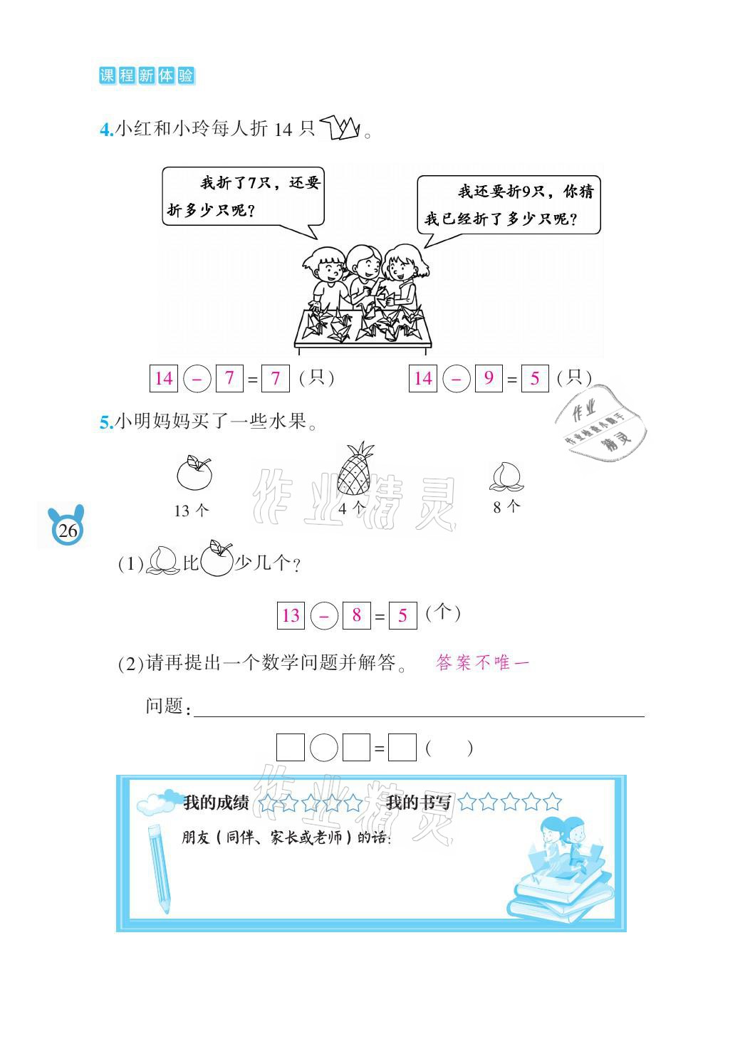 注:目前有些书本章节名称可能整理的还不是很完善,但都是按照顺序排列的,请同学们按照顺序仔细查找。练习册 2021年芝麻开花课程新体验一年级数学下册人教版 答案主要是用来给同学们做完题方便对答案用的,请勿直接抄袭。