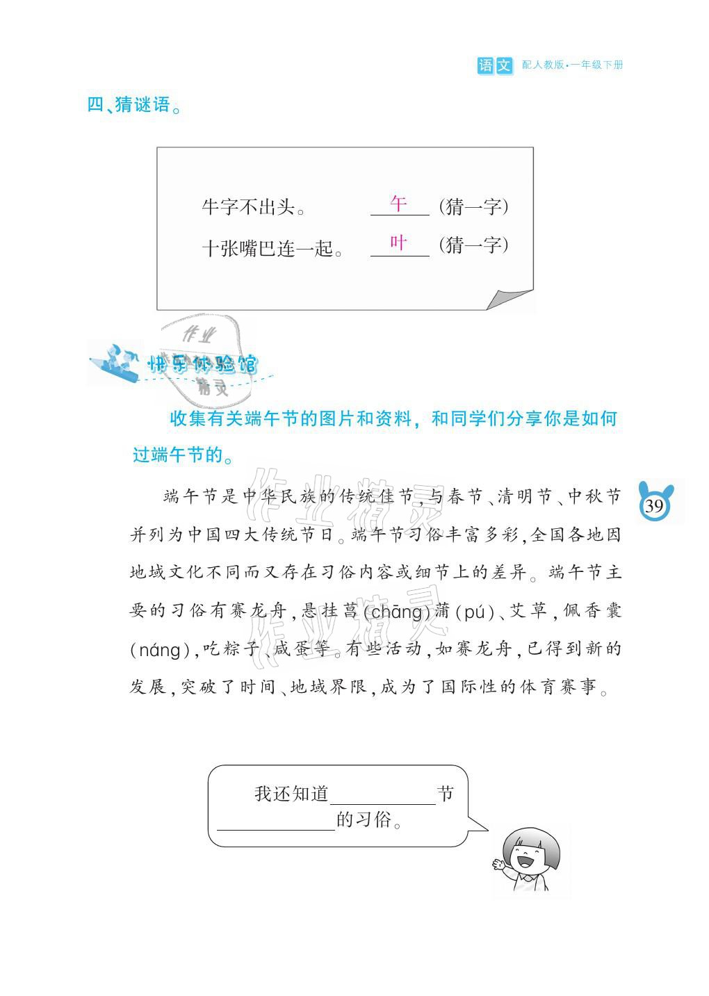 注:目前有些书本章节名称可能整理的还不是很完善,但都是按照顺序排列的,请同学们按照顺序仔细查找。练习册 2021年芝麻开花课程新体验一年级语文下册人教版 答案主要是用来给同学们做完题方便对答案用的,请勿直接抄袭。