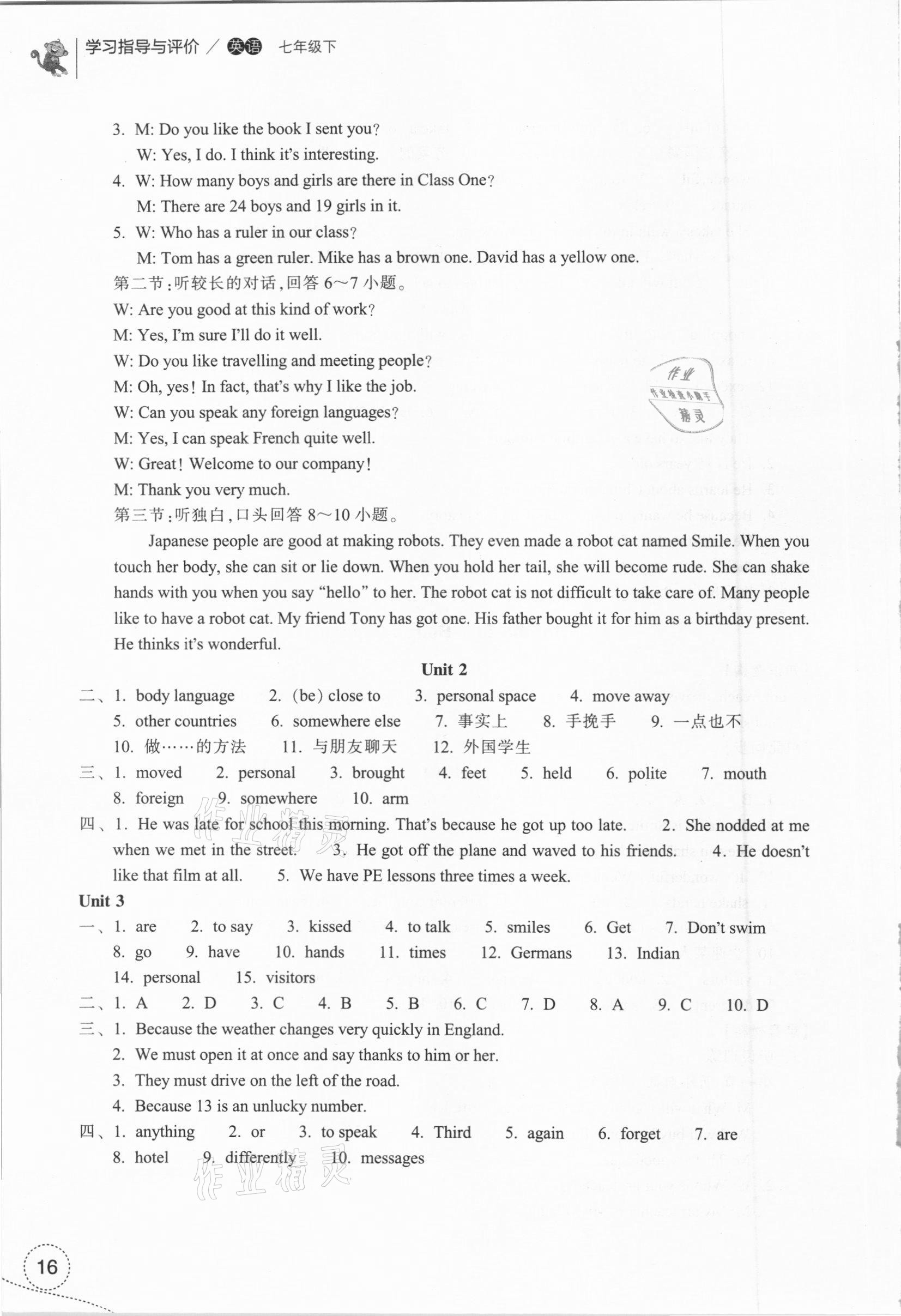 注:目前有些书本章节名称可能整理的还不是很完善,但都是按照顺序排列的,请同学们按照顺序仔细查找。练习册 2021年学习指导与评价七年级英语下册外研版 答案主要是用来给同学们做完题方便对答案用的,请勿直接抄袭。