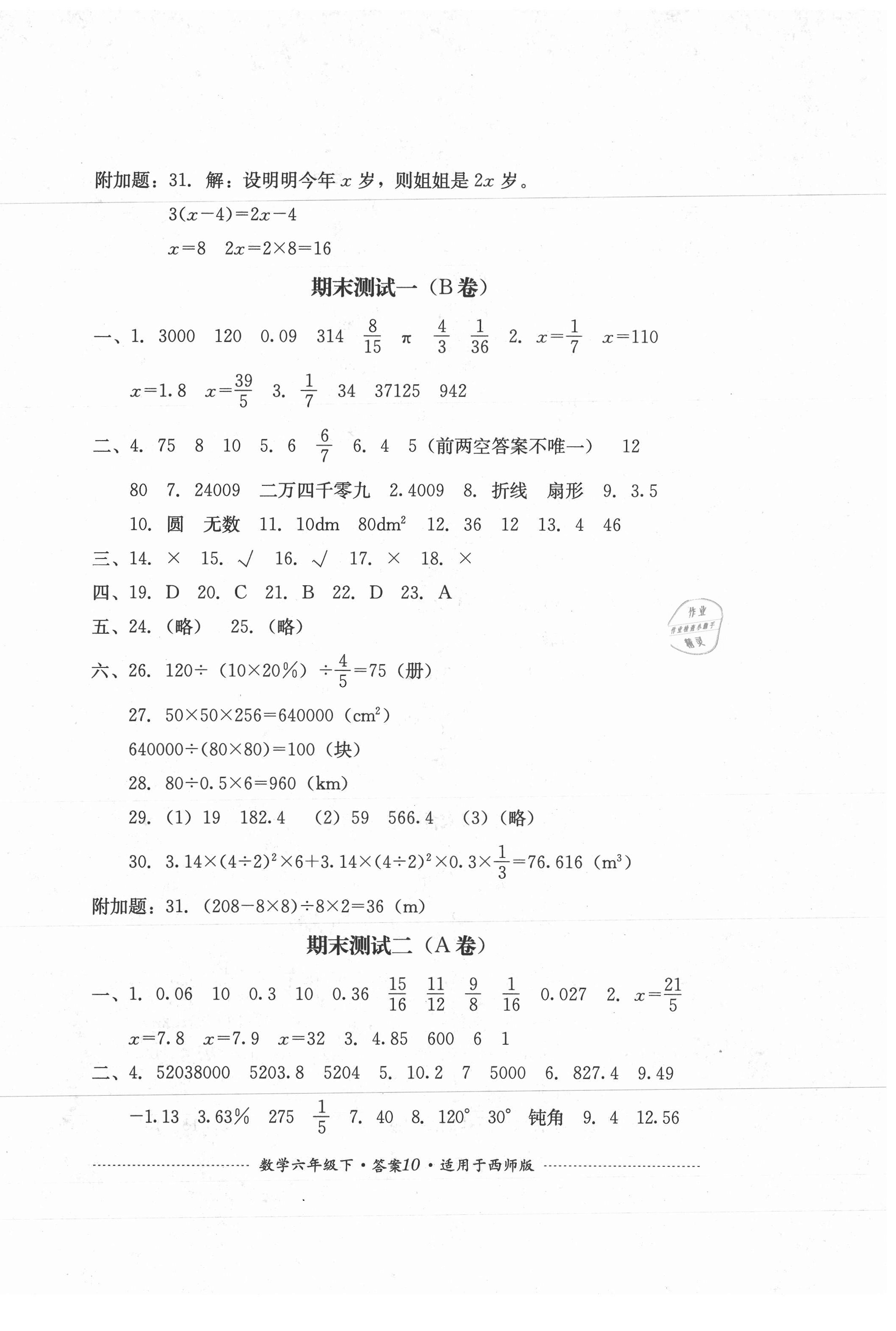 注:目前有些书本章节名称可能整理的还不是很完善,但都是按照顺序排列的,请同学们按照顺序仔细查找。练习册 2021年单元测试六年级数学下册西师大版四川教育出版社 答案主要是用来给同学们做完题方便对答案用的,请勿直接抄袭。