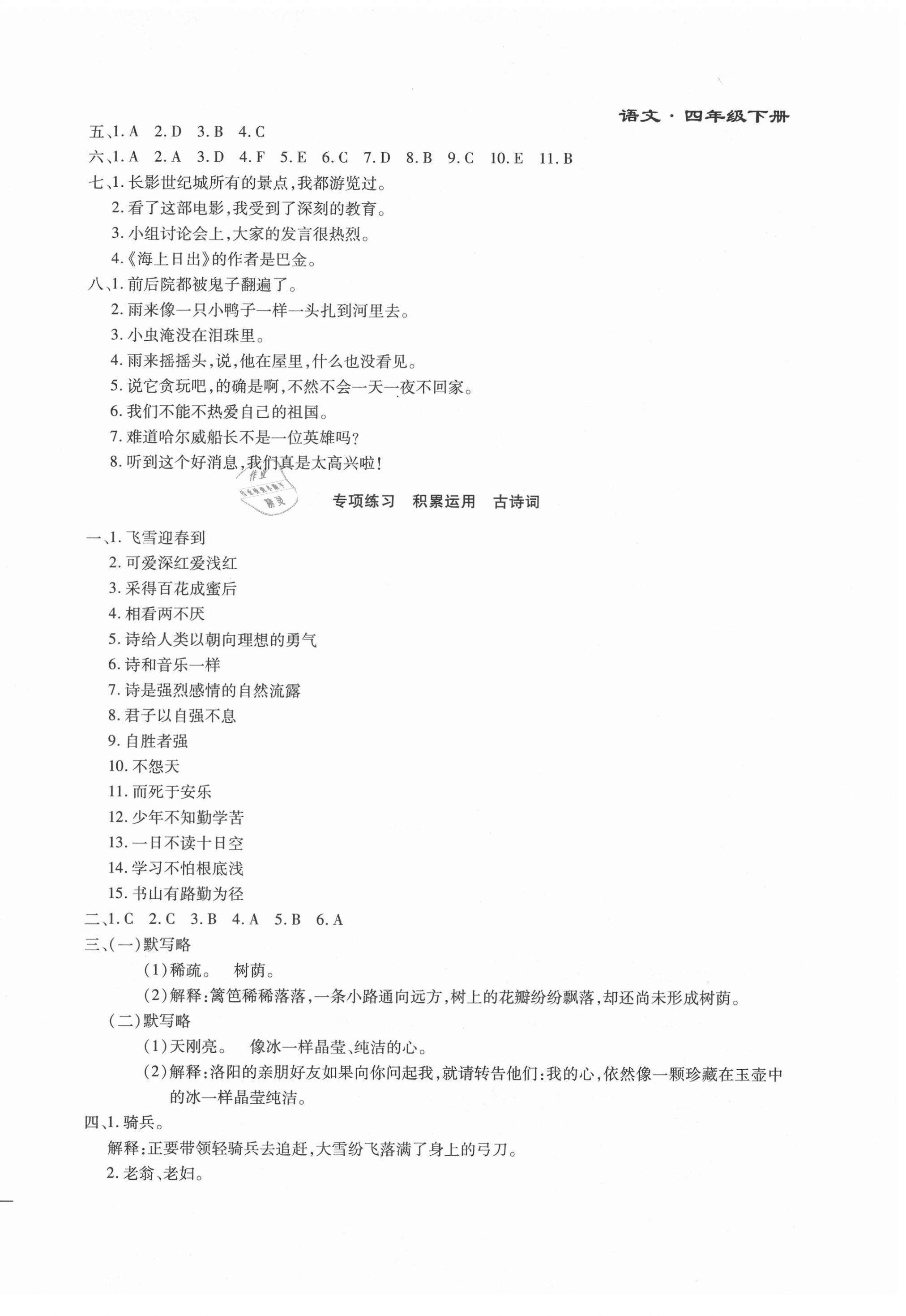 注:目前有些书本章节名称可能整理的还不是很完善,但都是按照顺序排列的,请同学们按照顺序仔细查找。练习册 2021年千里马单元测试卷四年级语文下册人教版 答案主要是用来给同学们做完题方便对答案用的,请勿直接抄袭。