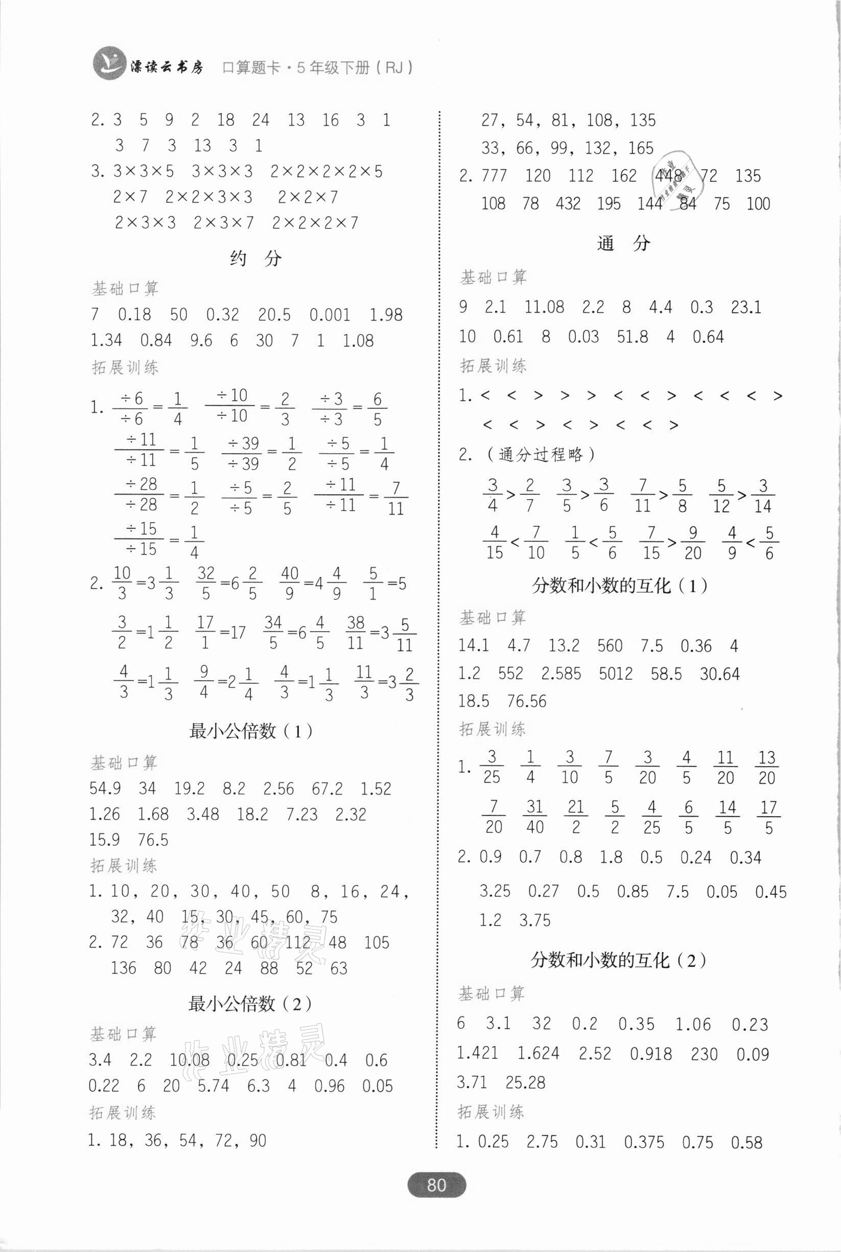 2021年口算题卡五年级下册人教版湖南教育出版社