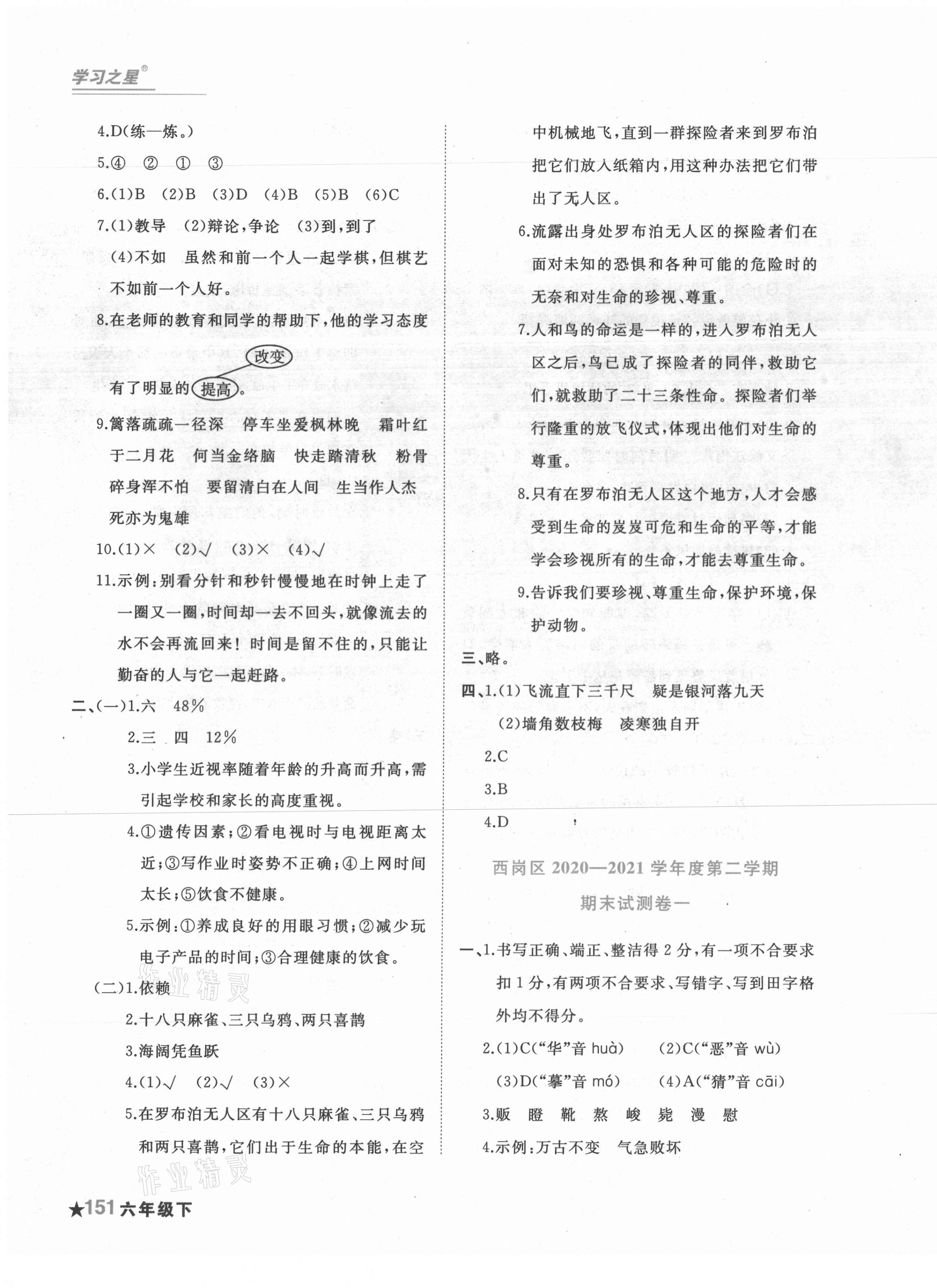 注:目前有些书本章节名称可能整理的还不是很完善,但都是按照顺序排列的,请同学们按照顺序仔细查找。练习册 2021年名校期末六年级语文下册人教版大连专版 答案主要是用来给同学们做完题方便对答案用的,请勿直接抄袭。