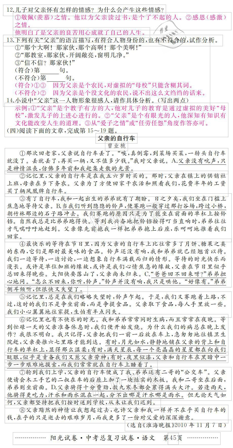 注:目前有些书本章节名称可能整理的还不是很完善,但都是按照顺序排列的,请同学们按照顺序仔细查找。练习册 2021年阳光试卷中考总复习试卷语文 答案主要是用来给同学们做完题方便对答案用的,请勿直接抄袭。