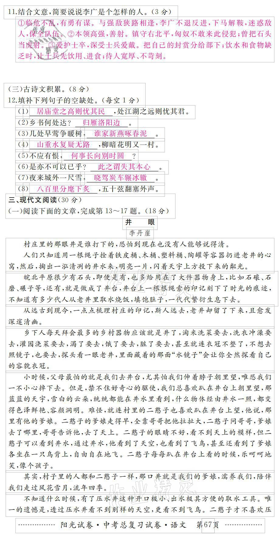 注:目前有些书本章节名称可能整理的还不是很完善,但都是按照顺序排列的,请同学们按照顺序仔细查找。练习册 2021年阳光试卷中考总复习试卷语文 答案主要是用来给同学们做完题方便对答案用的,请勿直接抄袭。
