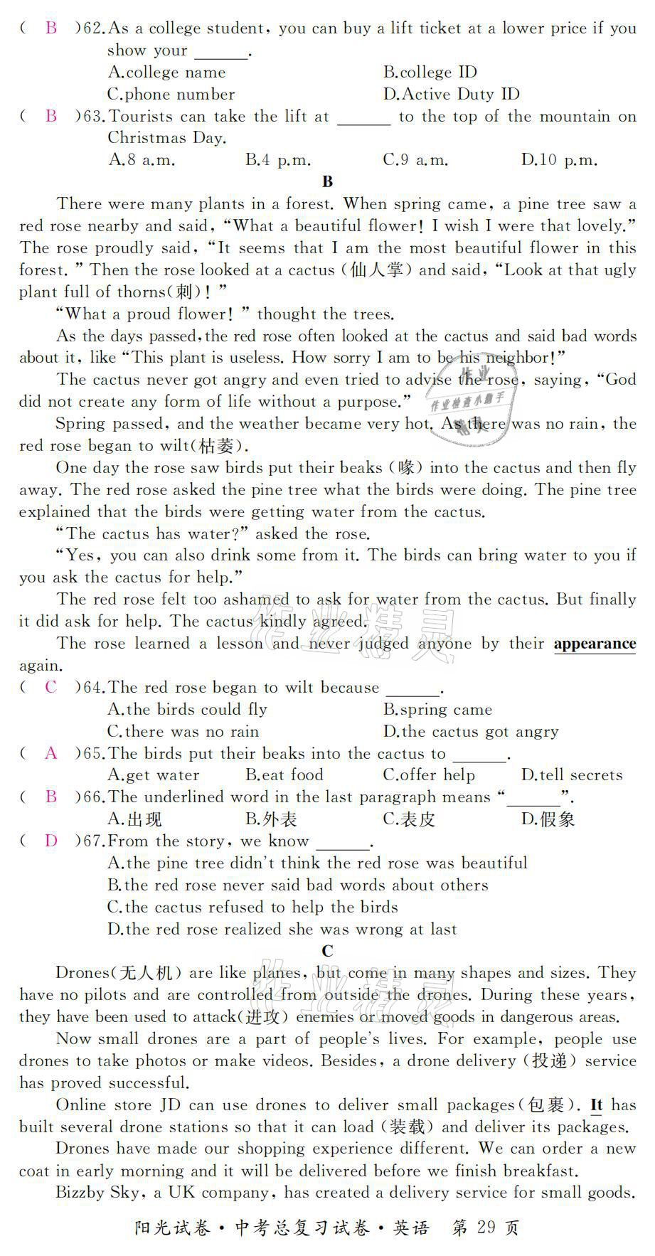 注:目前有些书本章节名称可能整理的还不是很完善,但都是按照顺序排列的,请同学们按照顺序仔细查找。练习册 2021年阳光试卷中考总复习试卷英语人教版 答案主要是用来给同学们做完题方便对答案用的,请勿直接抄袭。