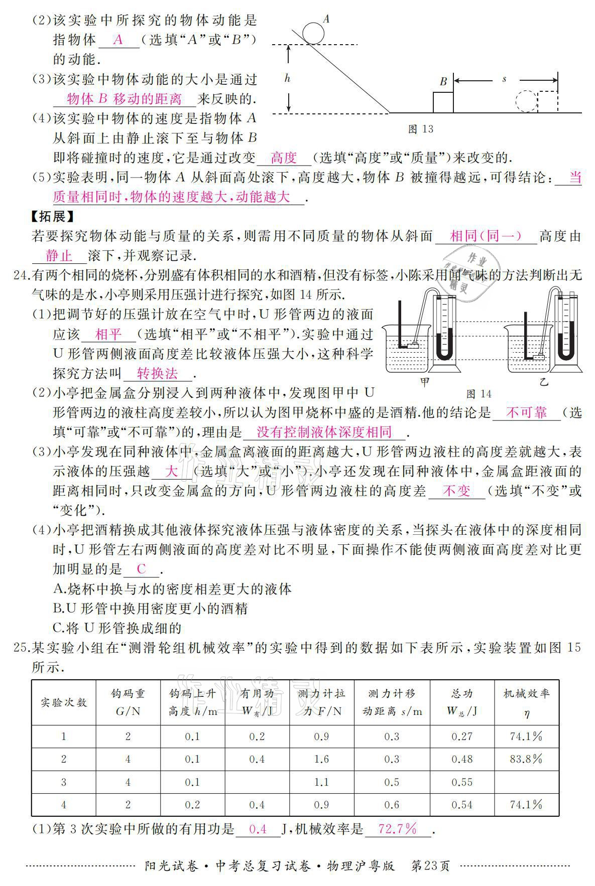 注:目前有些书本章节名称可能整理的还不是很完善,但都是按照顺序排列的,请同学们按照顺序仔细查找。练习册 2021年阳光试卷中考总复习试卷物理沪粤版 答案主要是用来给同学们做完题方便对答案用的,请勿直接抄袭。