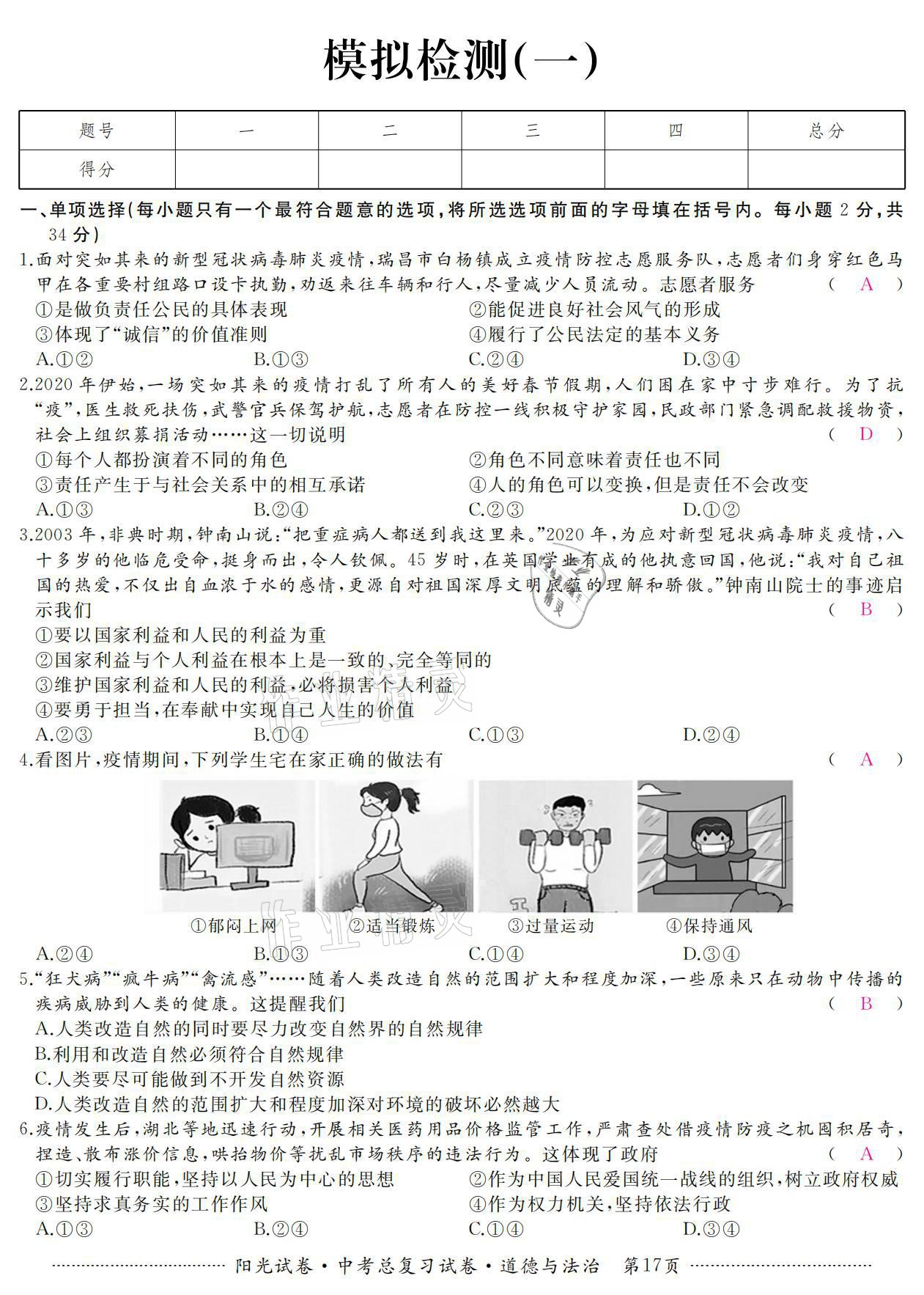 2021年阳光试卷中考总复习试卷道德与法治