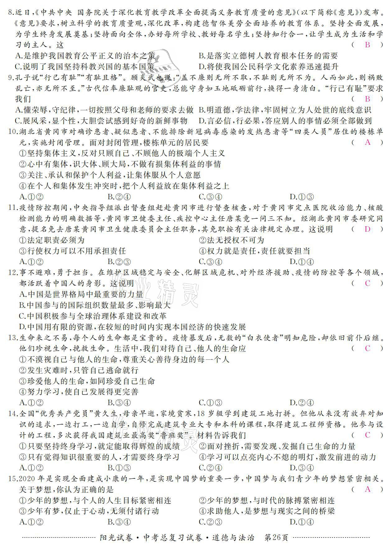 注:目前有些书本章节名称可能整理的还不是很完善,但都是按照顺序排列的,请同学们按照顺序仔细查找。练习册 2021年阳光试卷中考总复习试卷道德与法治 答案主要是用来给同学们做完题方便对答案用的,请勿直接抄袭。