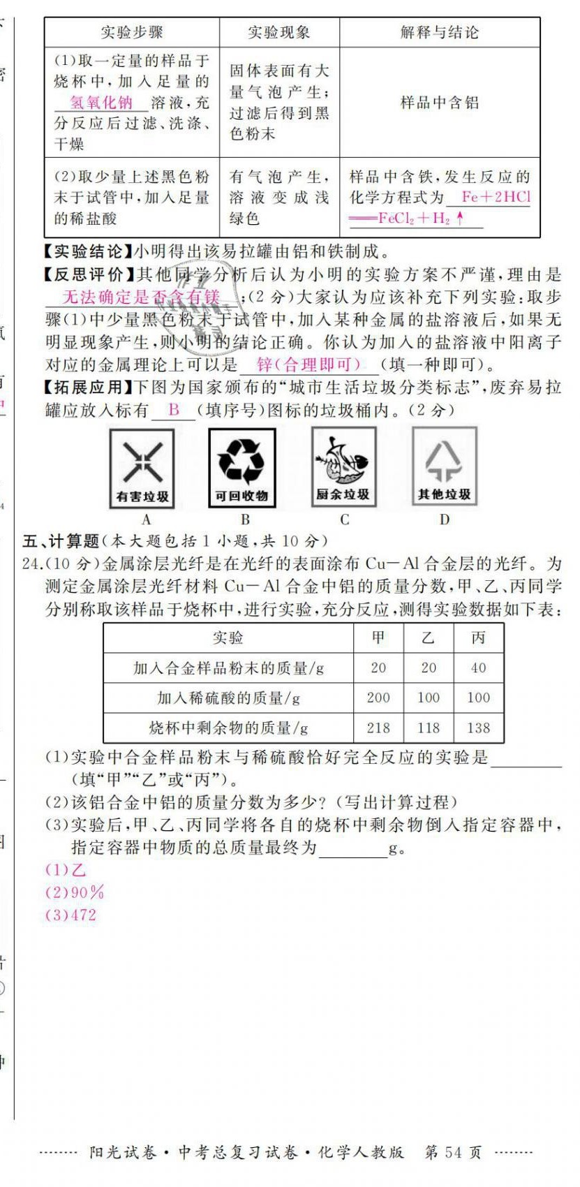注:目前有些书本章节名称可能整理的还不是很完善,但都是按照顺序排列的,请同学们按照顺序仔细查找。练习册 2021年阳光试卷中考总复习试卷化学人教版 答案主要是用来给同学们做完题方便对答案用的,请勿直接抄袭。