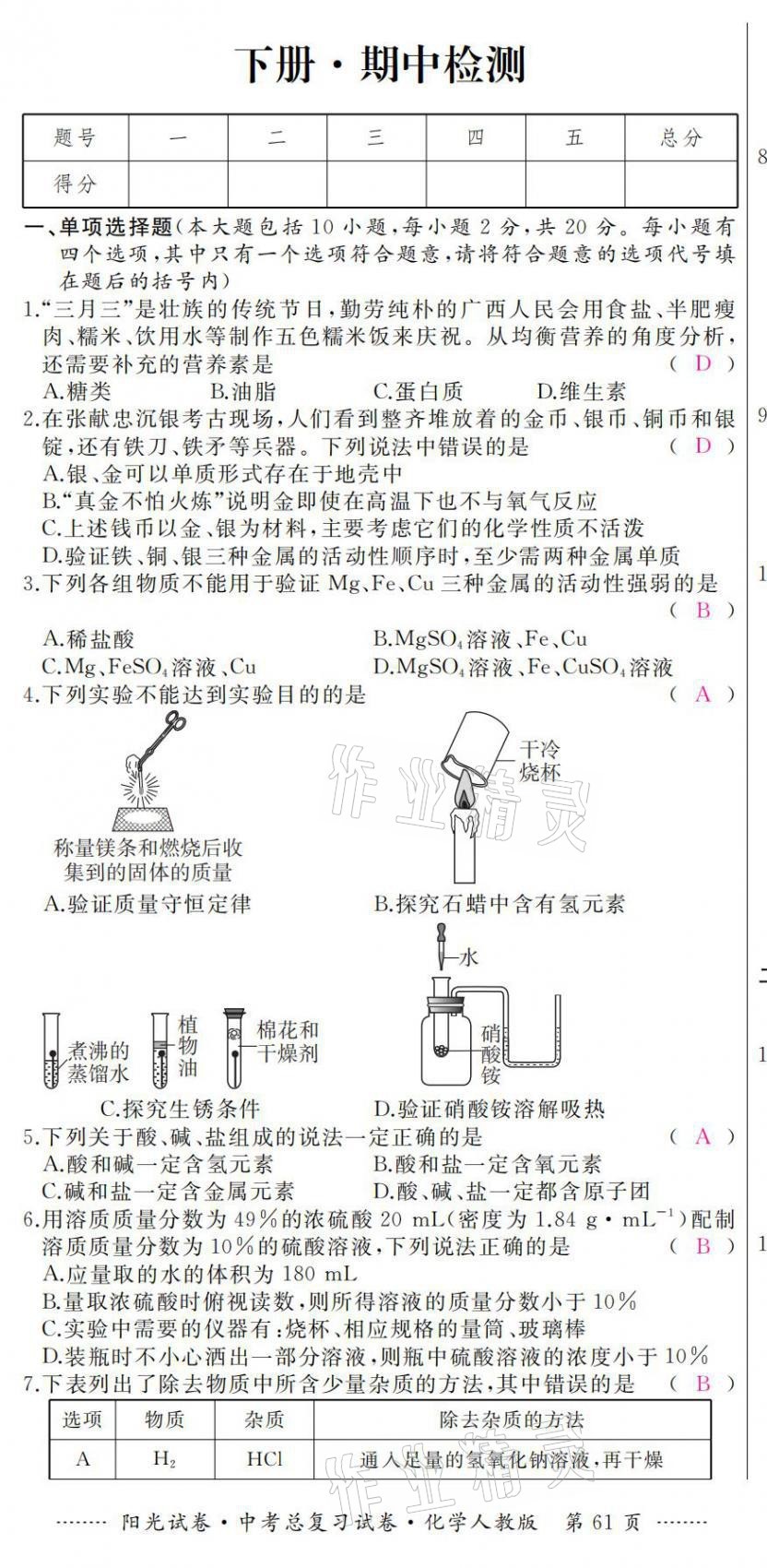 注:目前有些书本章节名称可能整理的还不是很完善,但都是按照顺序排列的,请同学们按照顺序仔细查找。练习册 2021年阳光试卷中考总复习试卷化学人教版 答案主要是用来给同学们做完题方便对答案用的,请勿直接抄袭。