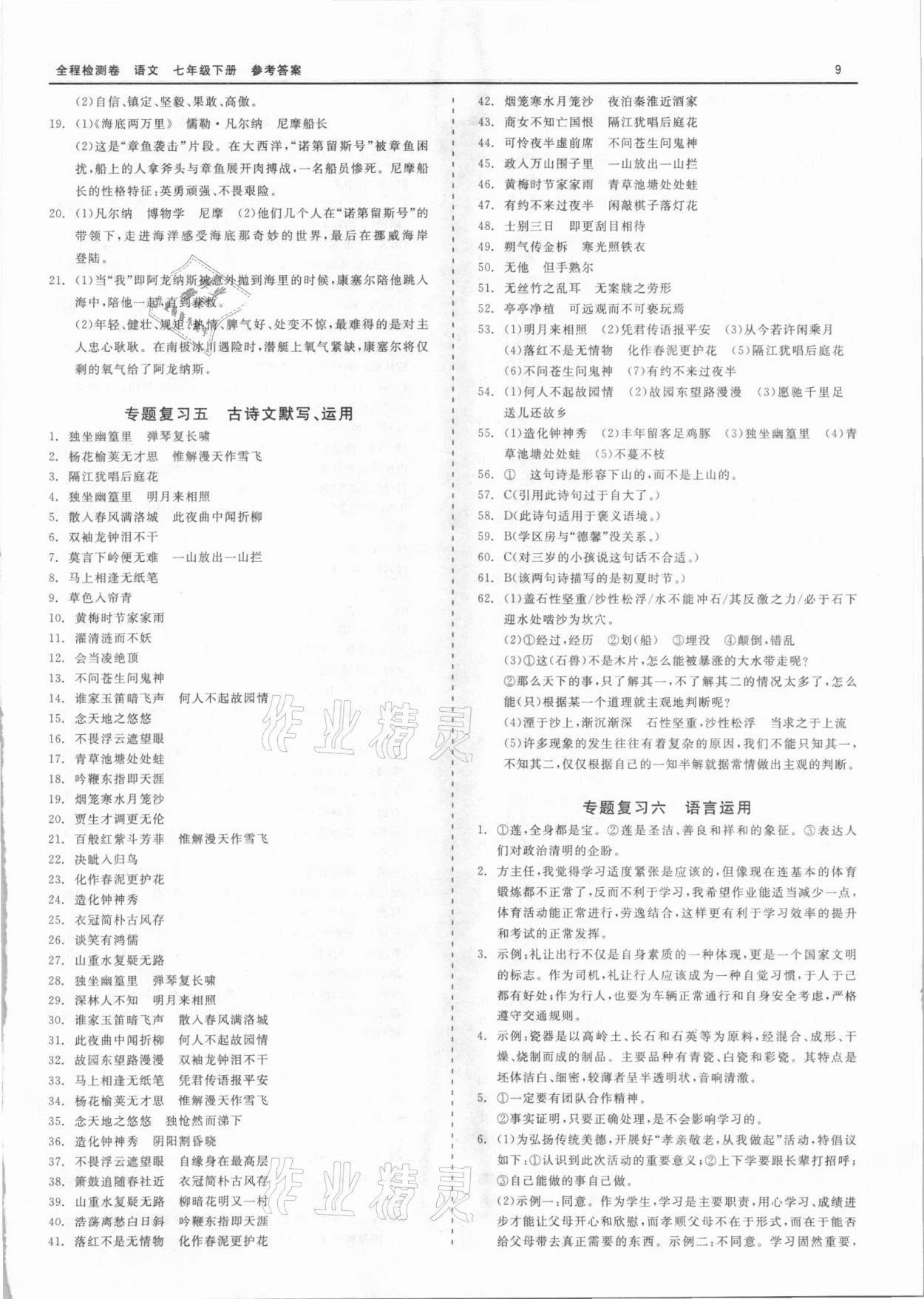 注:目前有些书本章节名称可能整理的还不是很完善,但都是按照顺序排列的,请同学们按照顺序仔细查找。练习册 2021年全程检测卷七年级语文下册人教版 答案主要是用来给同学们做完题方便对答案用的,请勿直接抄袭。