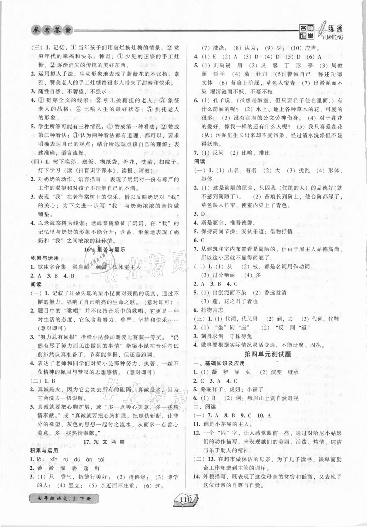 注:目前有些书本章节名称可能整理的还不是很完善,但都是按照顺序排列的,请同学们按照顺序仔细查找。练习册 2021年名师课堂一练通七年级语文下册人教版 答案主要是用来给同学们做完题方便对答案用的,请勿直接抄袭。