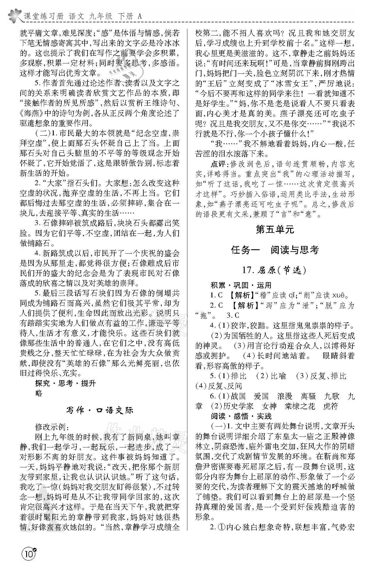 注:目前有些书本章节名称可能整理的还不是很完善,但都是按照顺序排列的,请同学们按照顺序仔细查找。练习册 2021年课堂练习册九年级语文下册人教版A版 答案主要是用来给同学们做完题方便对答案用的,请勿直接抄袭。