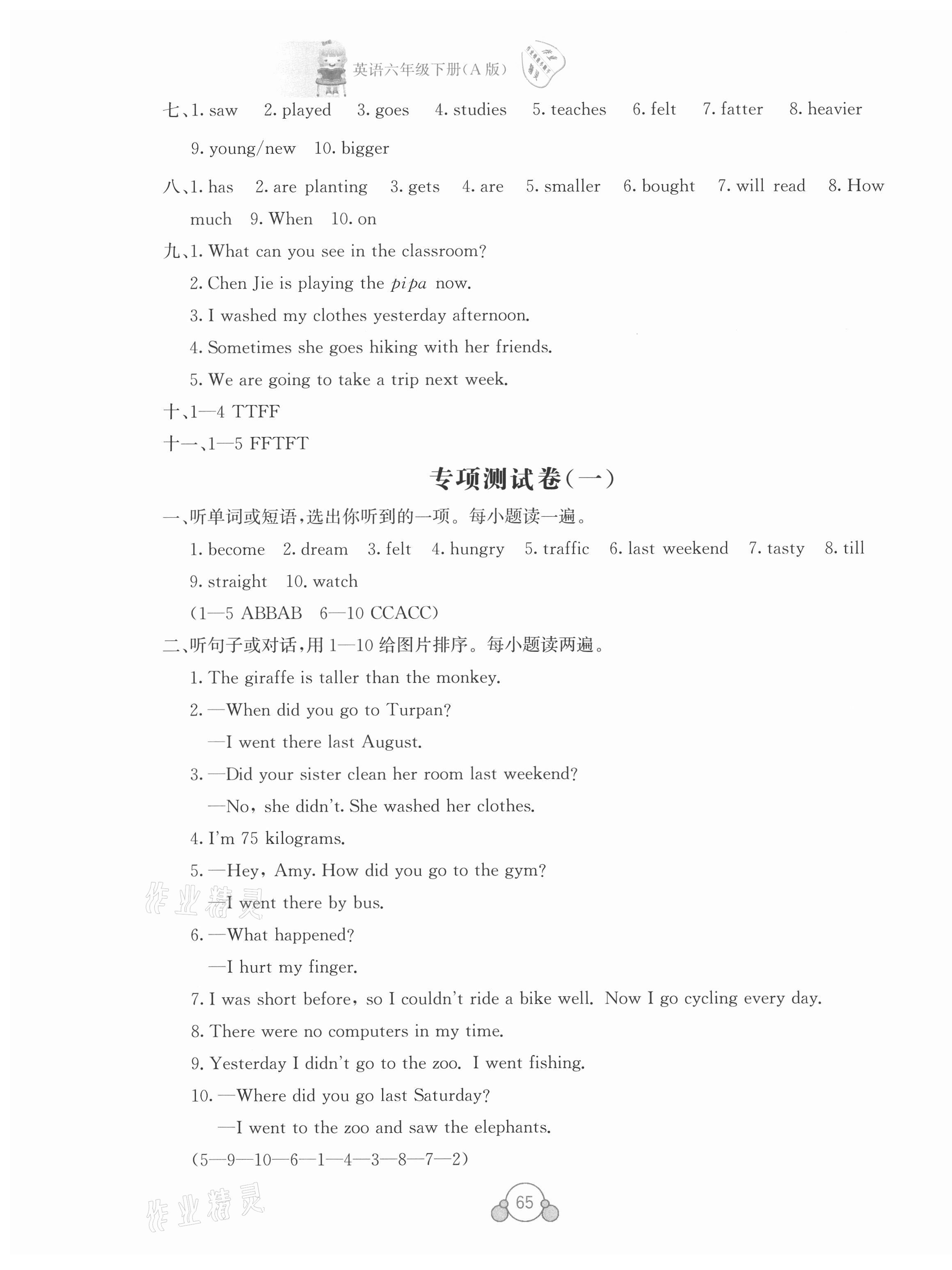 注:目前有些书本章节名称可能整理的还不是很完善,但都是按照顺序排列的,请同学们按照顺序仔细查找。练习册 2021年自主学习能力测评单元测试六年级英语下册A版 答案主要是用来给同学们做完题方便对答案用的,请勿直接抄袭。
