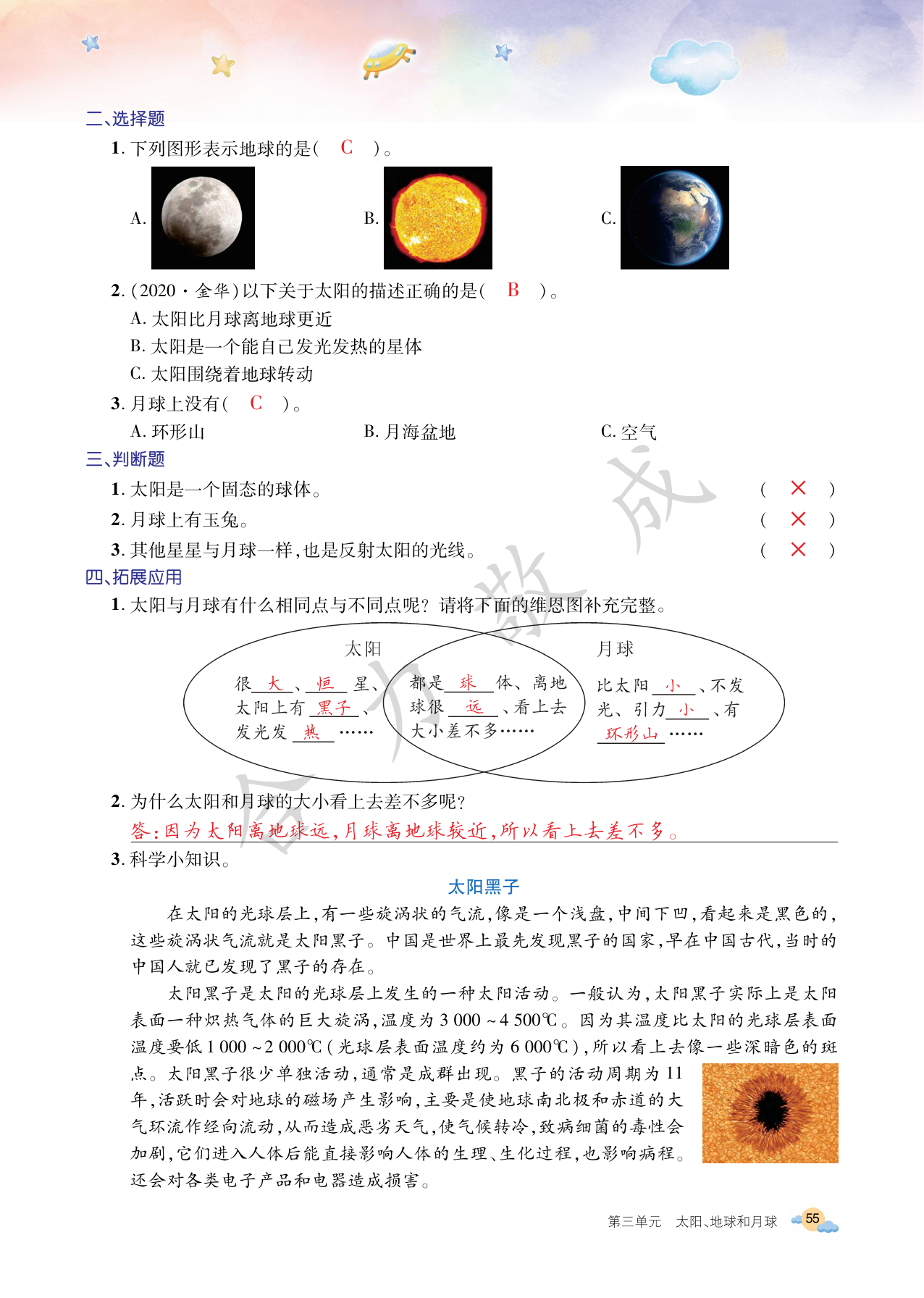 注:目前有些书本章节名称可能整理的还不是很完善,但都是按照顺序排列的,请同学们按照顺序仔细查找。练习册 2021年玩转科学三年级下册教科版B 答案主要是用来给同学们做完题方便对答案用的,请勿直接抄袭。