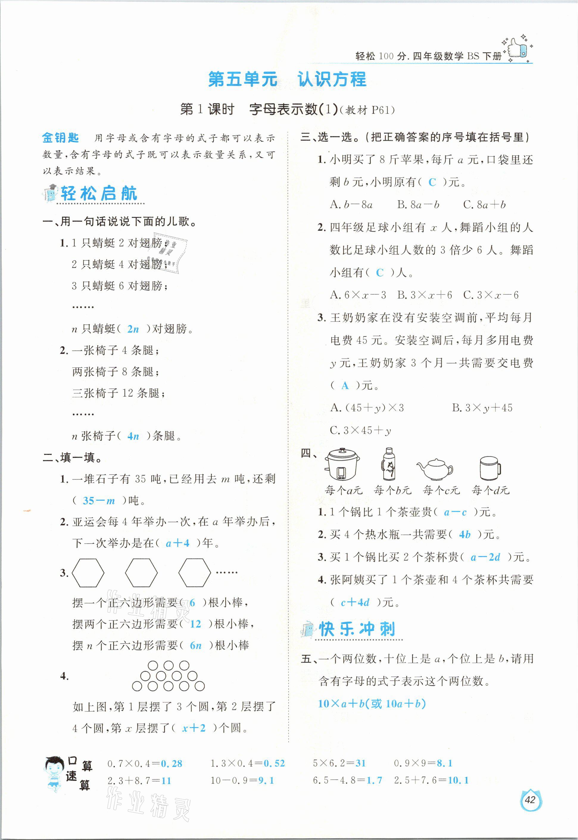 注:目前有些书本章节名称可能整理的还不是很完善,但都是按照顺序排列的,请同学们按照顺序仔细查找。练习册 2021年轻松学习100分四年级数学下册北师大版 答案主要是用来给同学们做完题方便对答案用的,请勿直接抄袭。