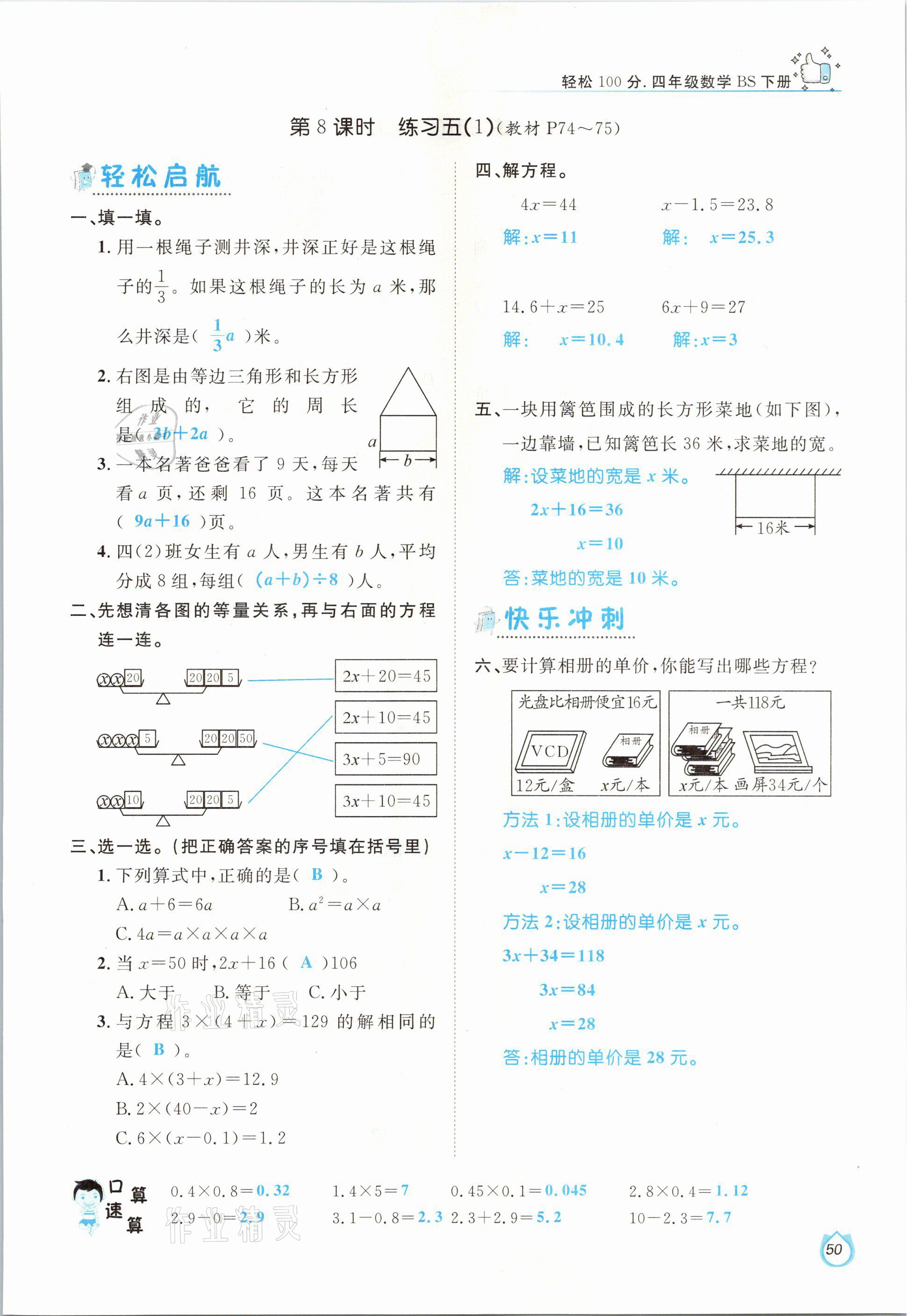 注:目前有些书本章节名称可能整理的还不是很完善,但都是按照顺序排列的,请同学们按照顺序仔细查找。练习册 2021年轻松学习100分四年级数学下册北师大版 答案主要是用来给同学们做完题方便对答案用的,请勿直接抄袭。