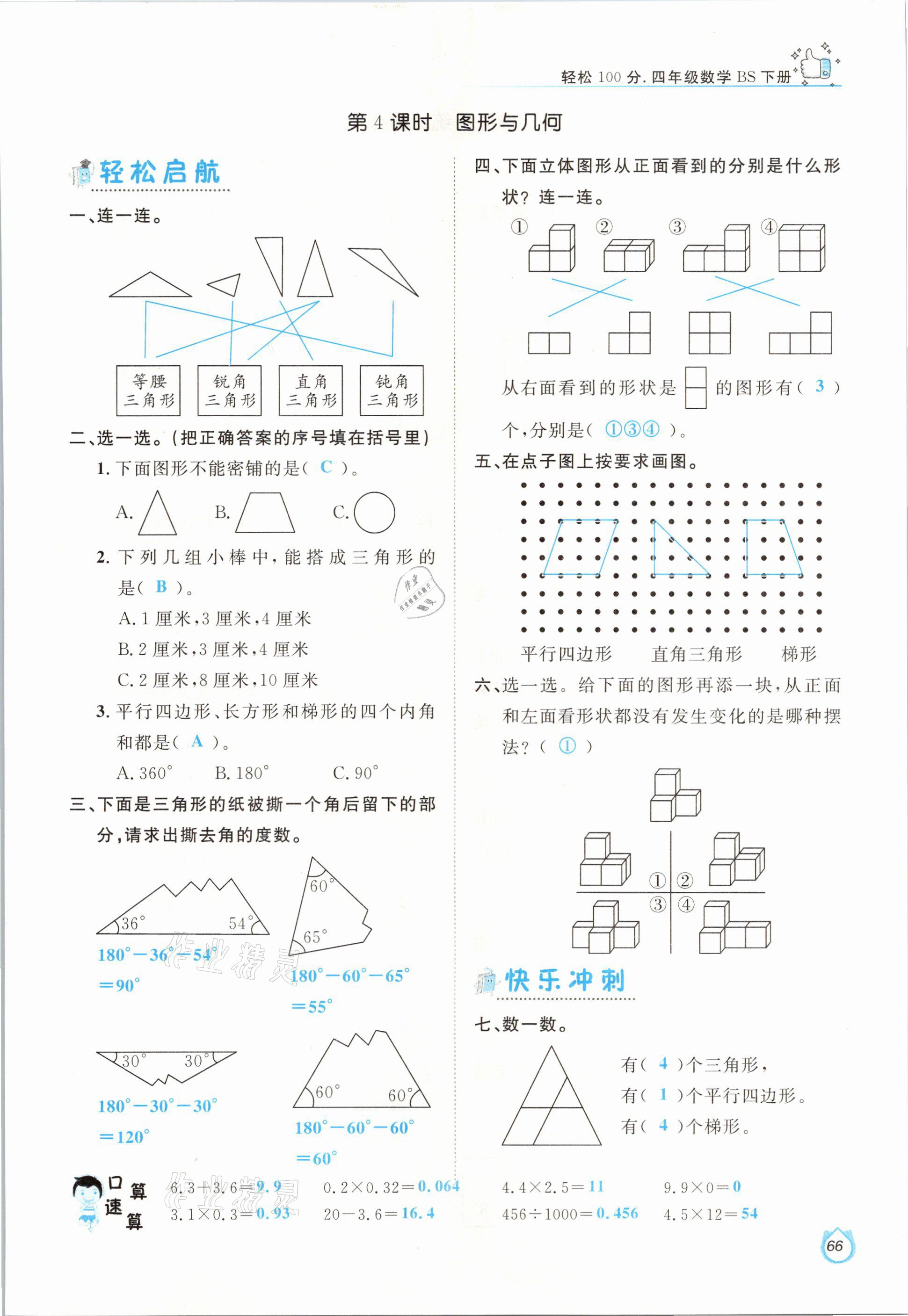 注:目前有些书本章节名称可能整理的还不是很完善,但都是按照顺序排列的,请同学们按照顺序仔细查找。练习册 2021年轻松学习100分四年级数学下册北师大版 答案主要是用来给同学们做完题方便对答案用的,请勿直接抄袭。