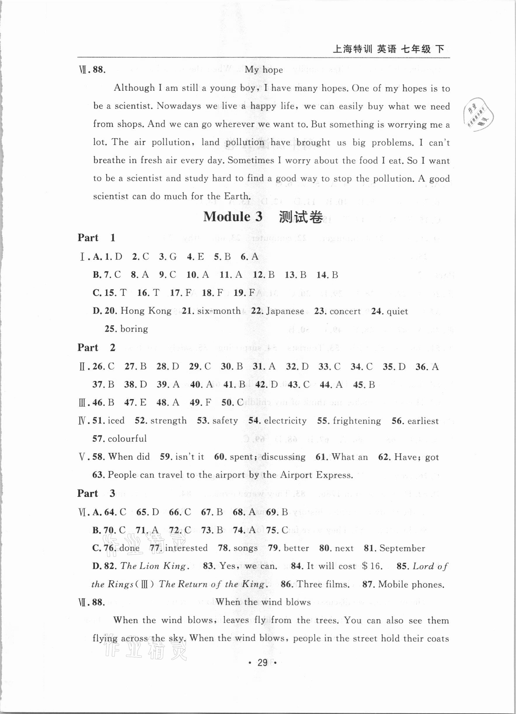 注:目前有些书本章节名称可能整理的还不是很完善,但都是按照顺序排列的,请同学们按照顺序仔细查找。练习册 2021年上海特训七年级英语下册沪教版 答案主要是用来给同学们做完题方便对答案用的,请勿直接抄袭。